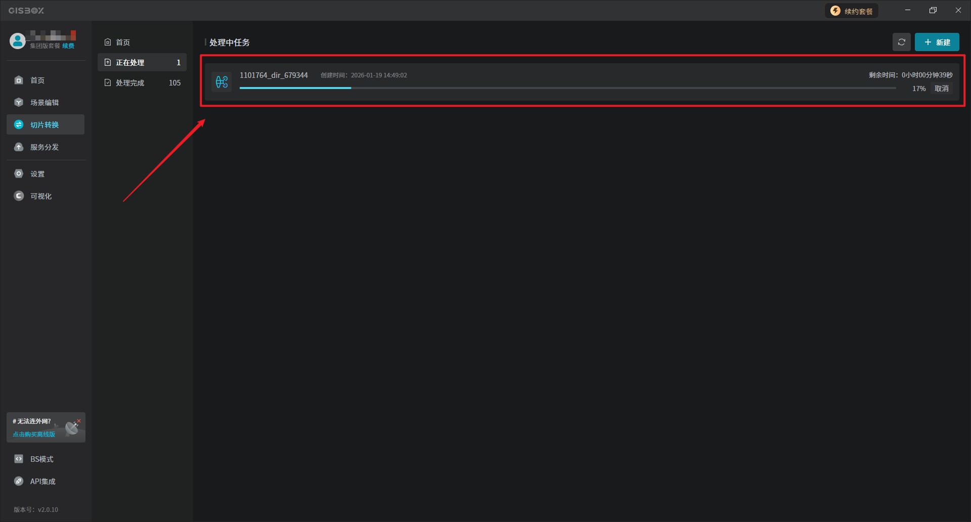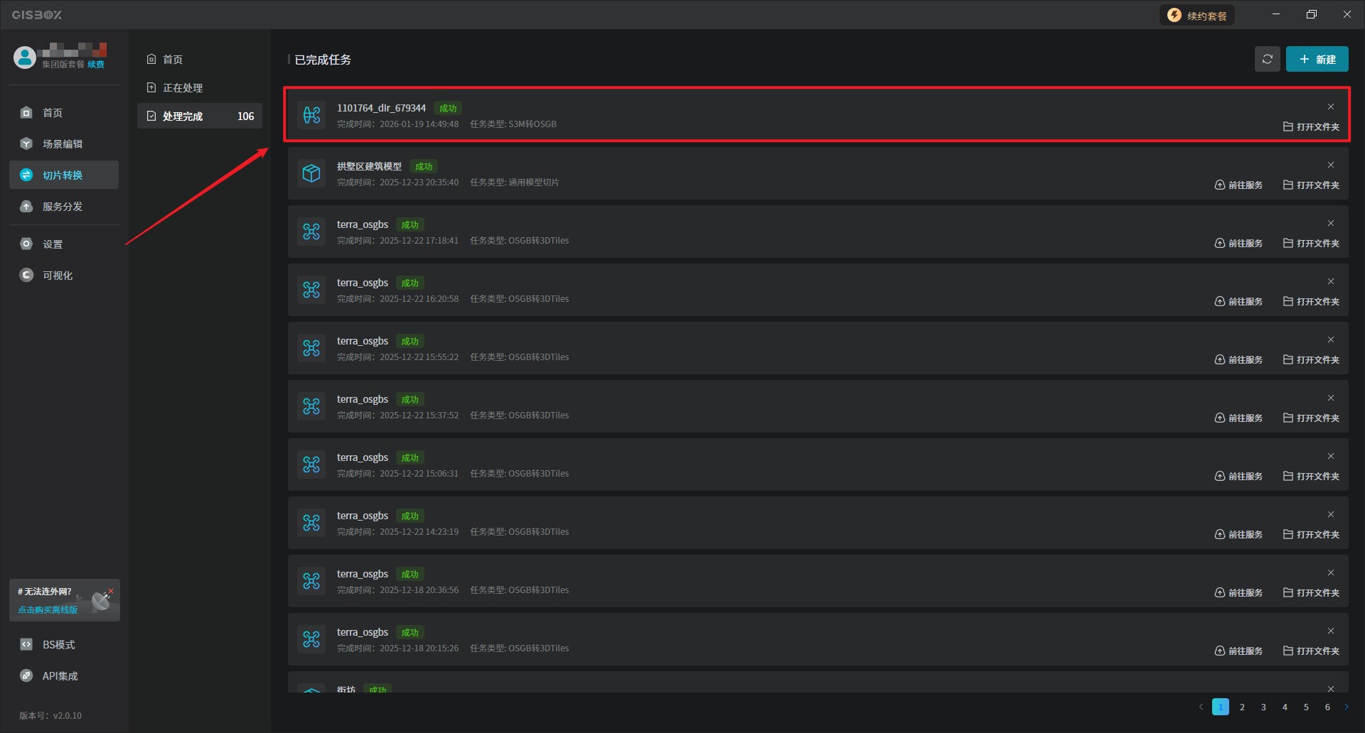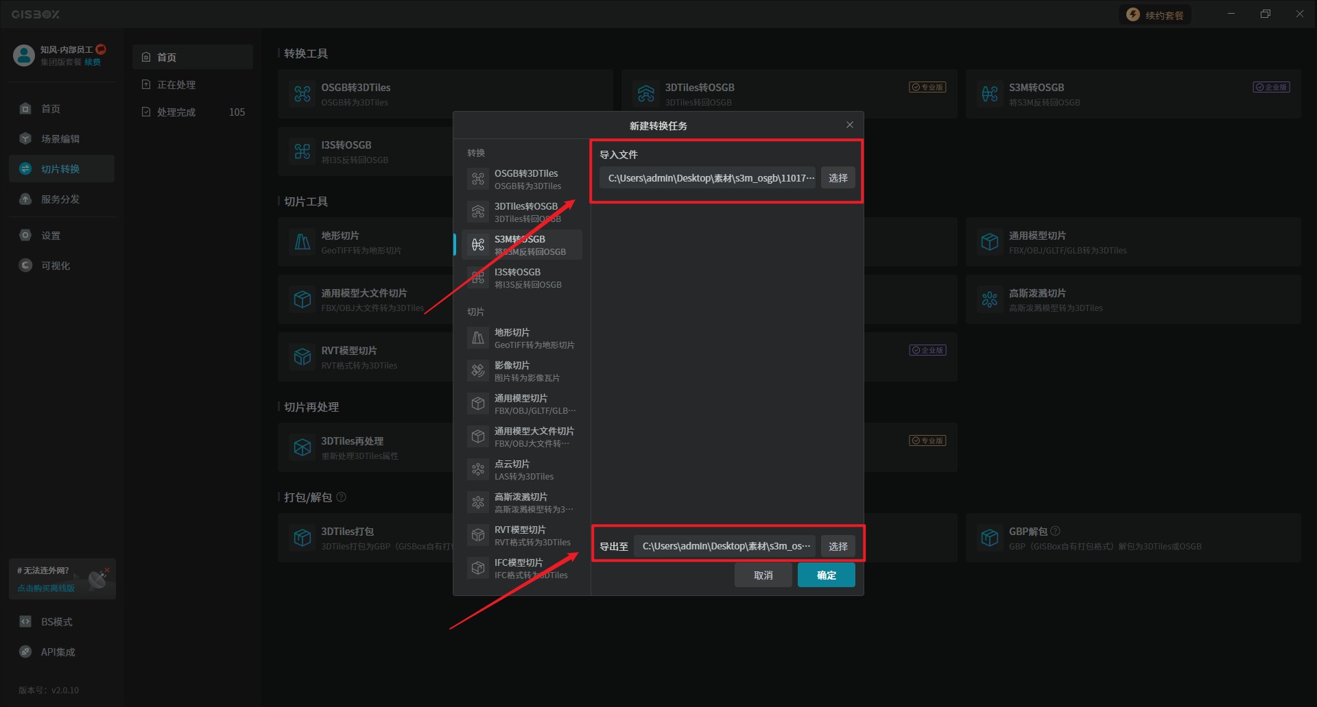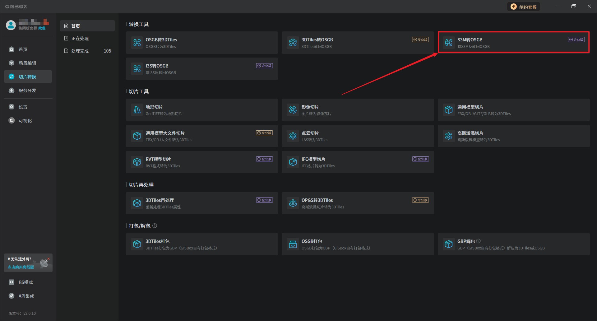 1、打开我们已经下载好的“GISBox”软件,点击右侧的“切片转换”,在其首页界面的中选择“S3M转OSGB”。(注意该功能需要升级至企业版使用)