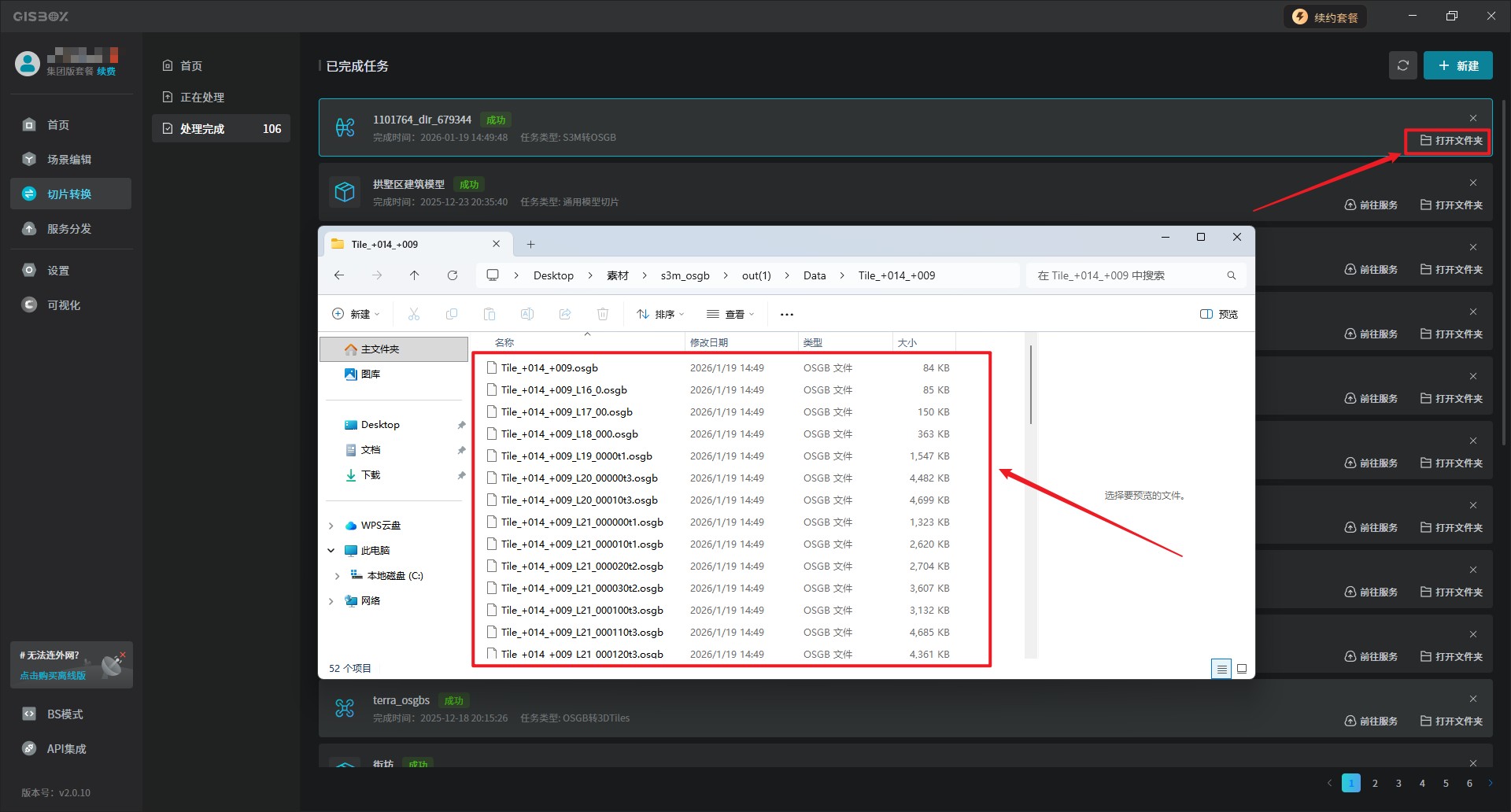 5、我们点击“打开文件夹”图标按钮,就可以看到由GISBox将S3M转换成OSGB的格式文件。
