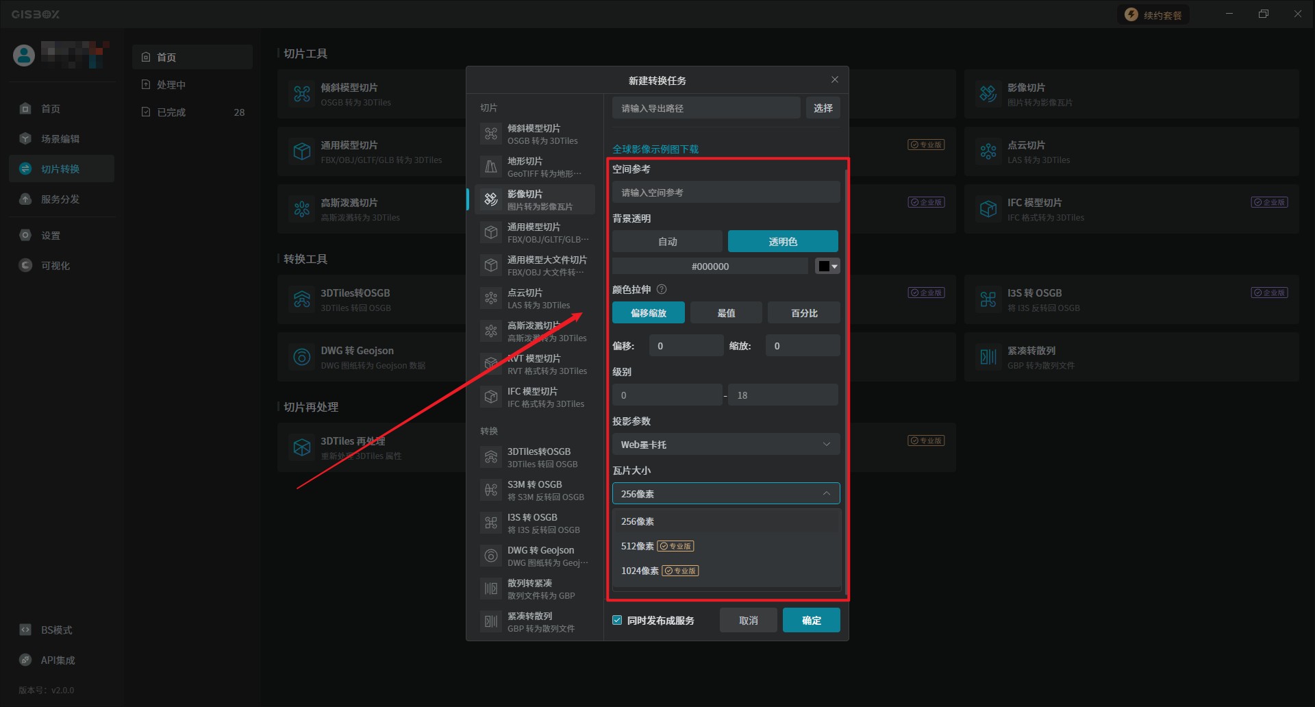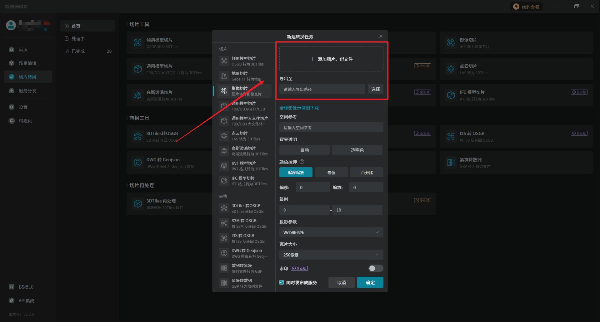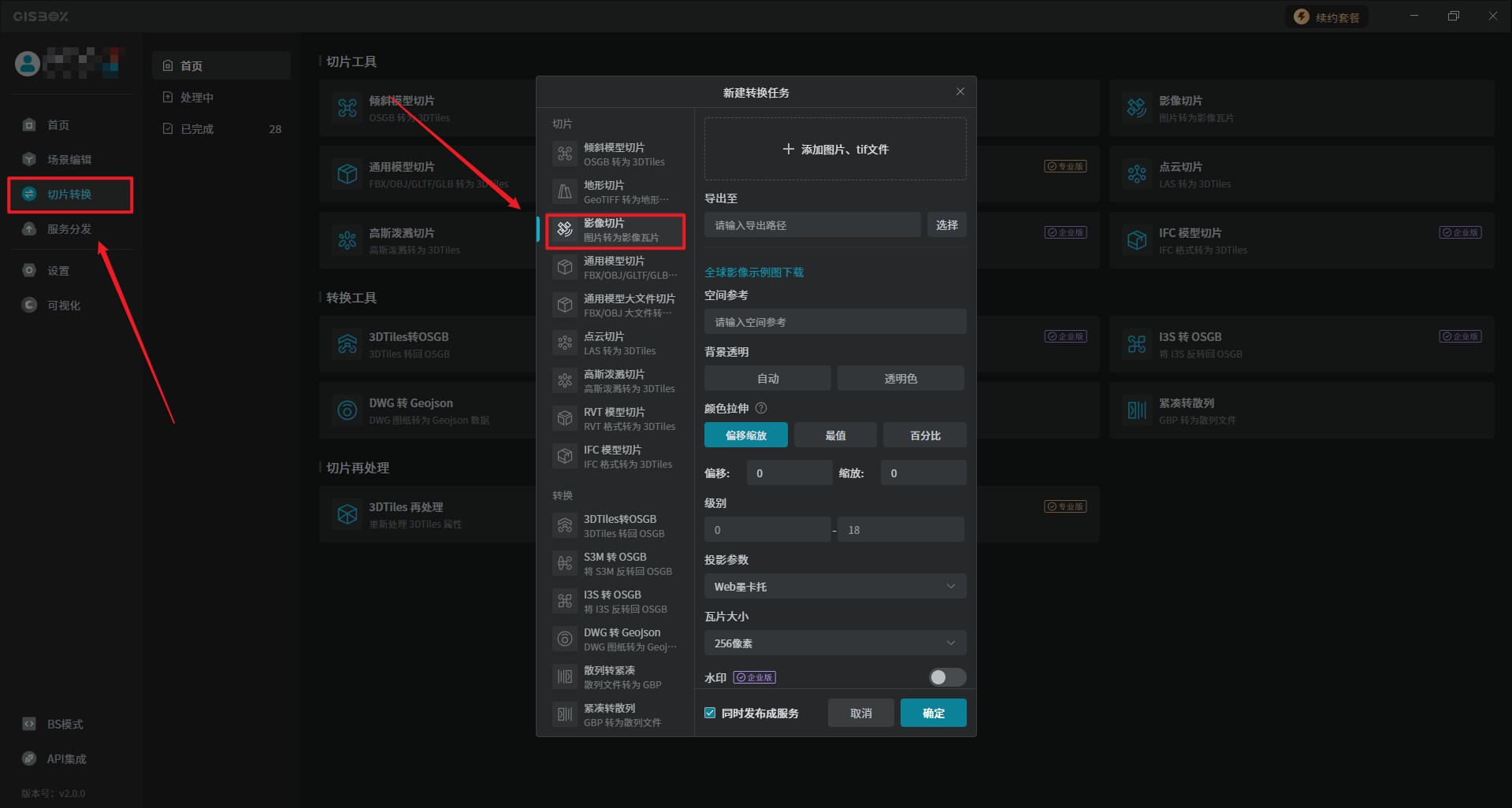 1、首先打开GISBox软件点击“切片转换”,选择“影像切片”,并进行“新建转换任务”设置。