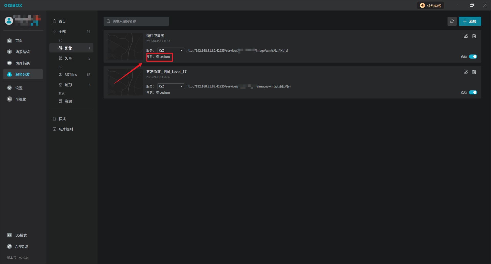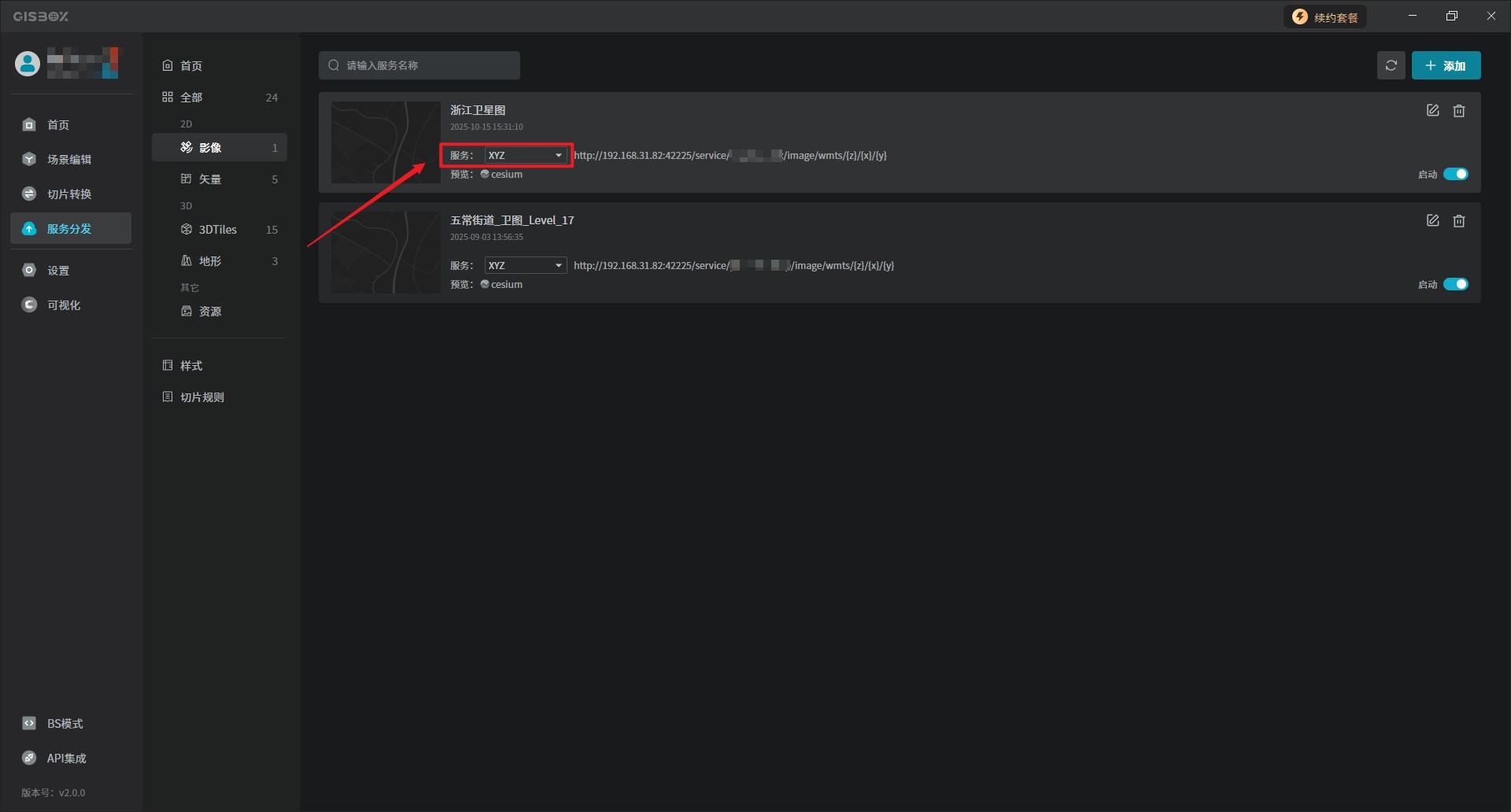 5、在服务中可以点击“服务”按钮,选择发布需要的协议类型(XYZ/WMS/WMTS)。