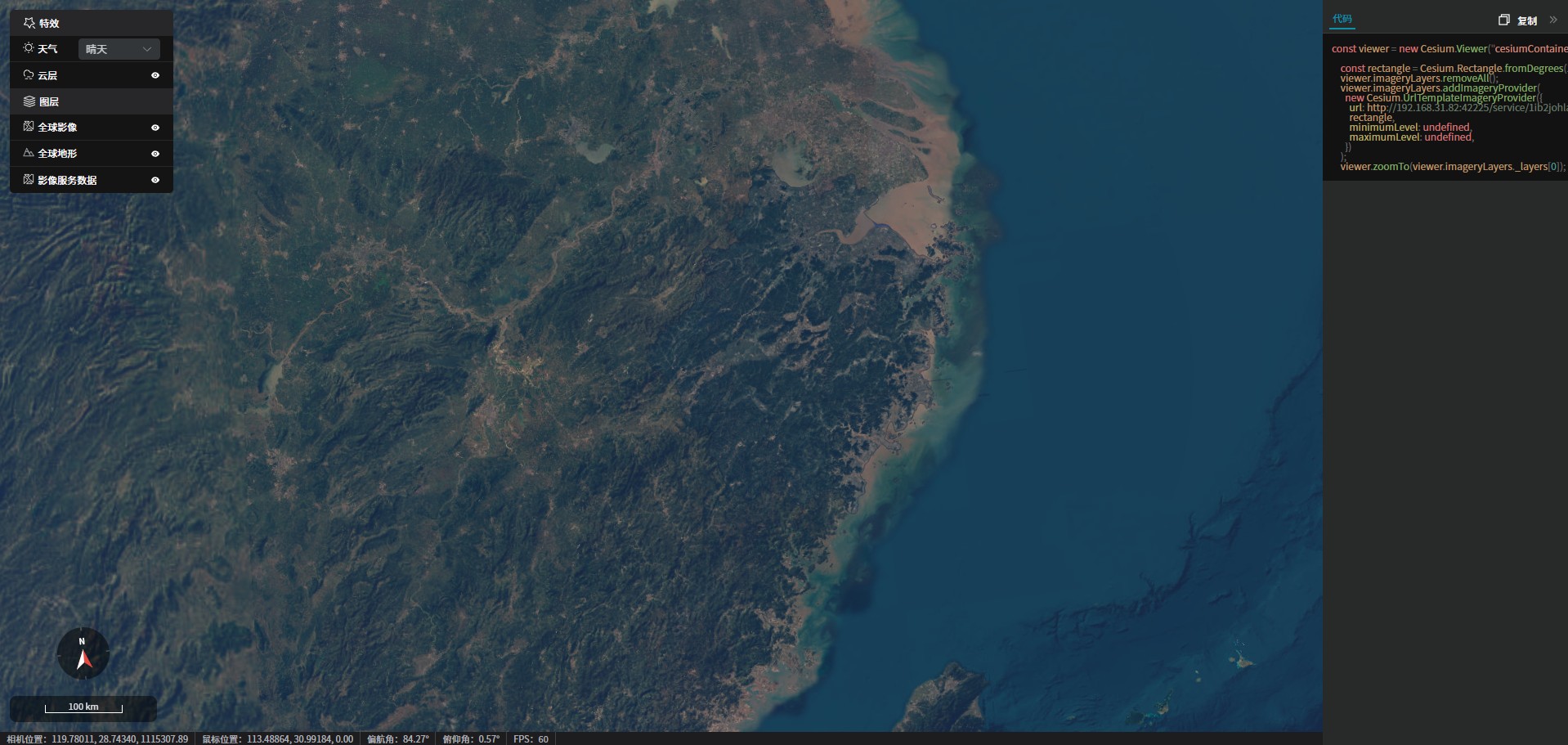 6、点击“cesium”预览框架,直接可以在浏览器中进行效果预览。生成的服务地址可以复制到Cesium的imagery provider相关设置中进行加载使用。