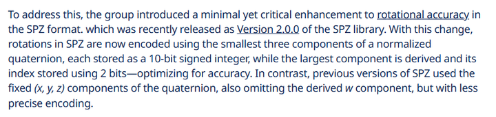 之前spz的时候,是将w分量直接除进其他三个分量,再对其他三个分量进行压缩。spz2是把值小的三个分量压缩进一个10bit的int,然后用一个2bit的空间来存储到底哪个分量是值最大的。也就是说把确定的w分量变成了不确定的最大的那个分量。这样可以大幅提高旋转数据的精度。
