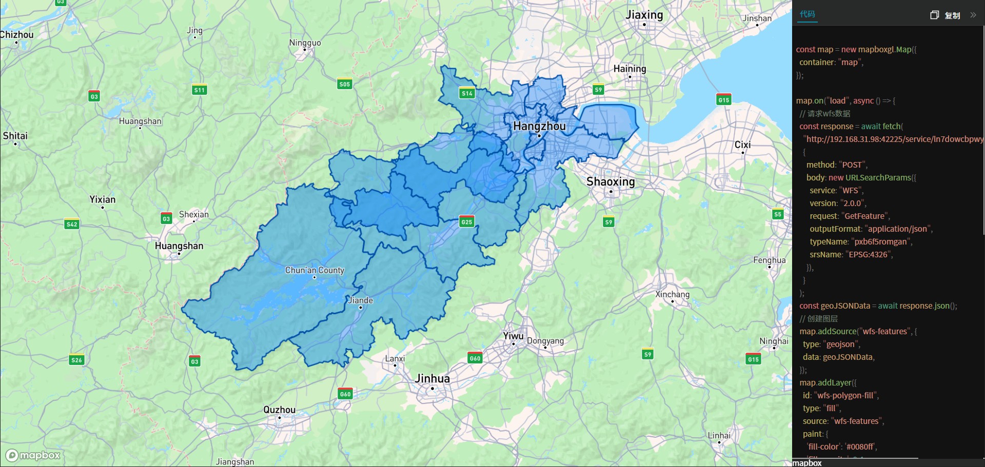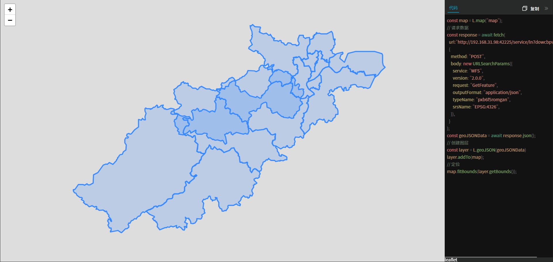 在3D中GISBox只提供了cesium一种预览框架,而在2D中提供了四种预览框架,我们以矢量服务为例,为大家依次看一下效果图: