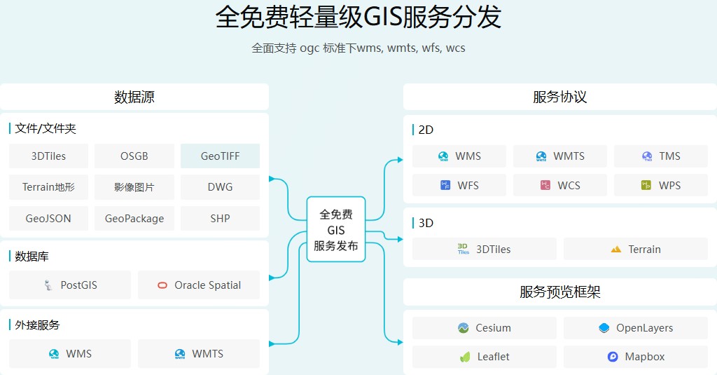 GISBox中的服务分发就是内置的强大且免费的GIS服务器,不仅支持3D数据如3DTiles、地形数据的发布,也支持2D数据的发布,可以导入栅格数据如GEOTIFF,JPG,PNG等,也可以导入矢量数据如GEOJSON,SHAPE文件等,也支持POSTGIS等数据库服务的接入。导入数据后支持发布成OGC标准下的WMS,WMTS,WFS以及MVT协议。发布成功的服务可以直接在cesium、mapbox等预览框架中预览。