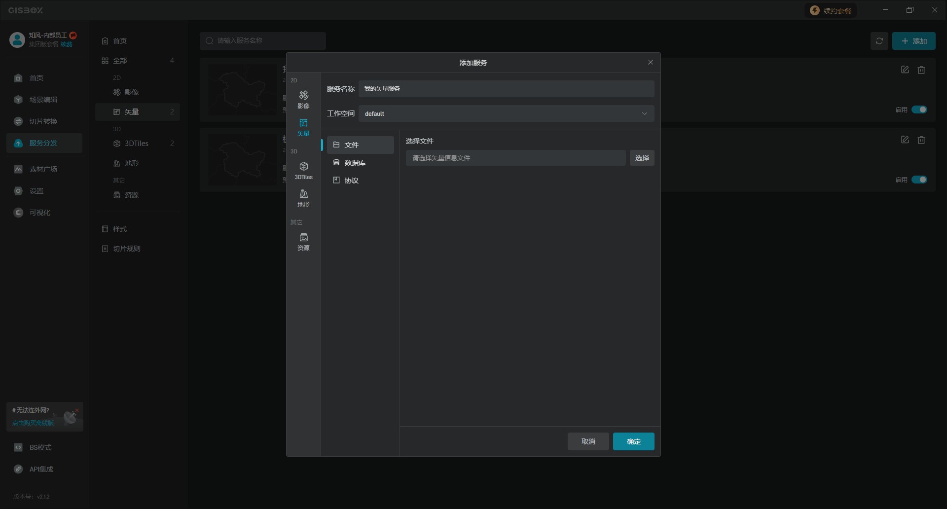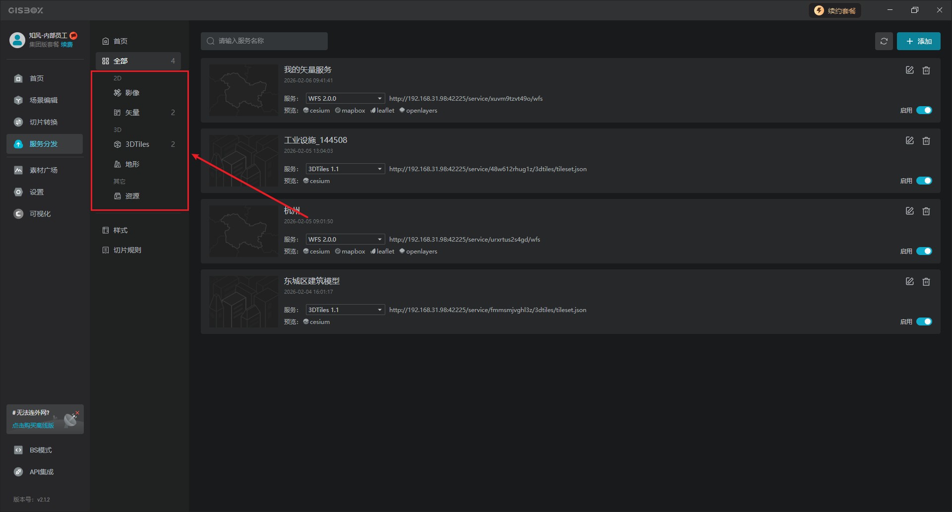 GISBox软件与其他软件不同的是它是一款三合一的轻量化GIS工具。它将传统GIS解决方案中的Desktop编辑器,Server服务器,以及数据工具等多个功能集成到了一个软件当中。实现了一站式的二三维GIS场景编辑,数据转换切片及GIS服务的分发。本文主要具体带大家了解一下“服务分发”板块。