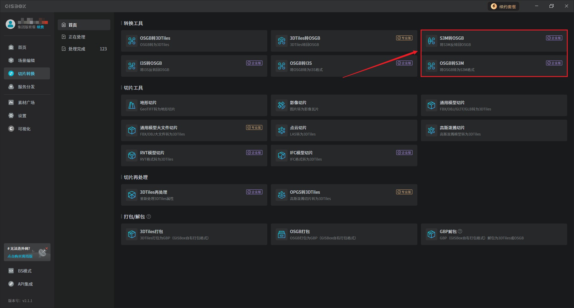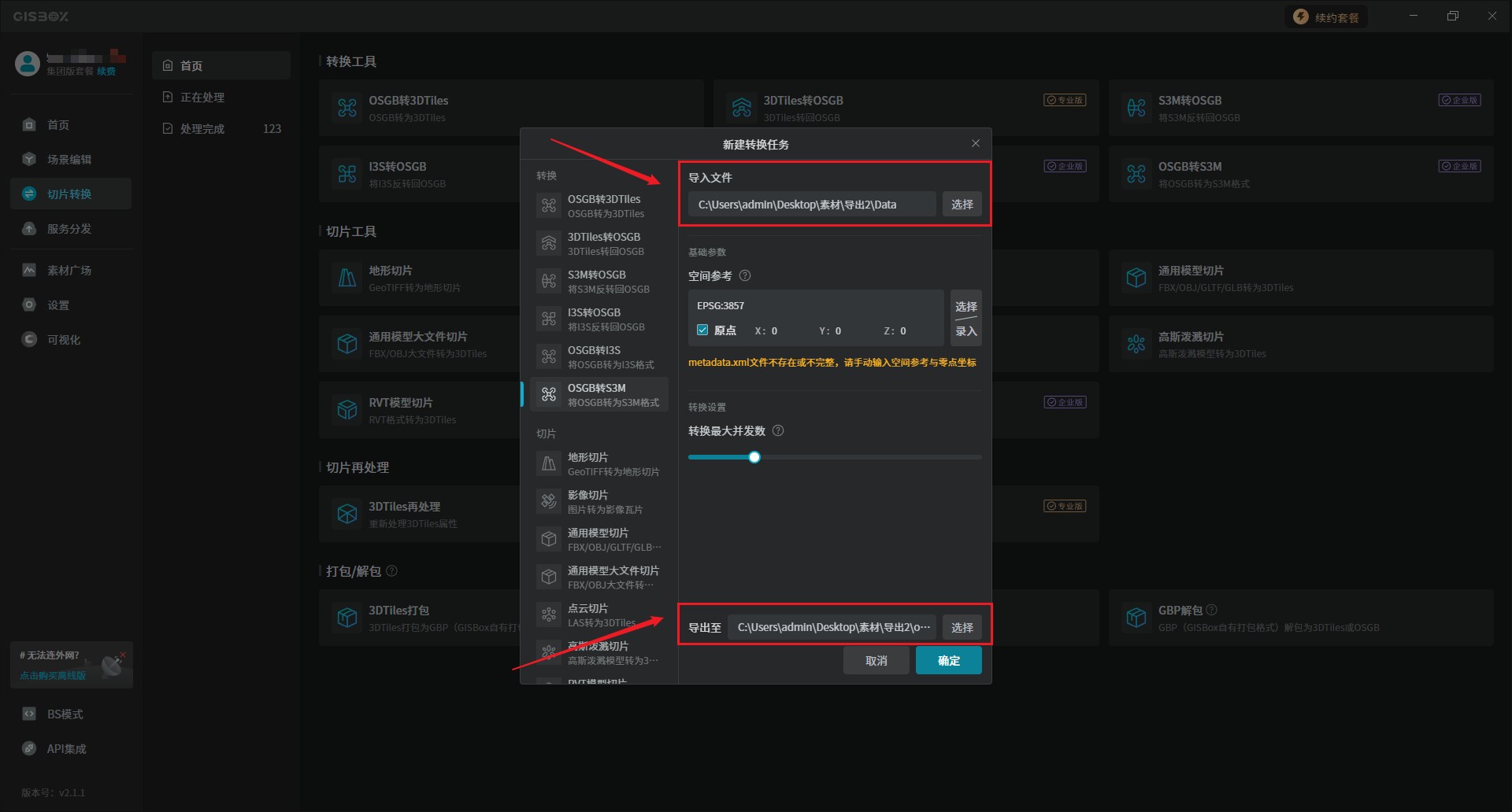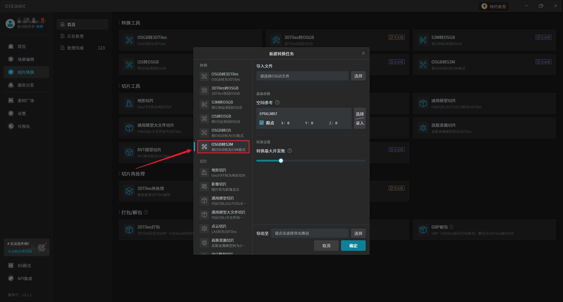 1、打开GISBox软件,在“切片转换”板块中选择“OSGB转S3M”,此时界面就会弹出一个“新建转换任务”的窗口。
