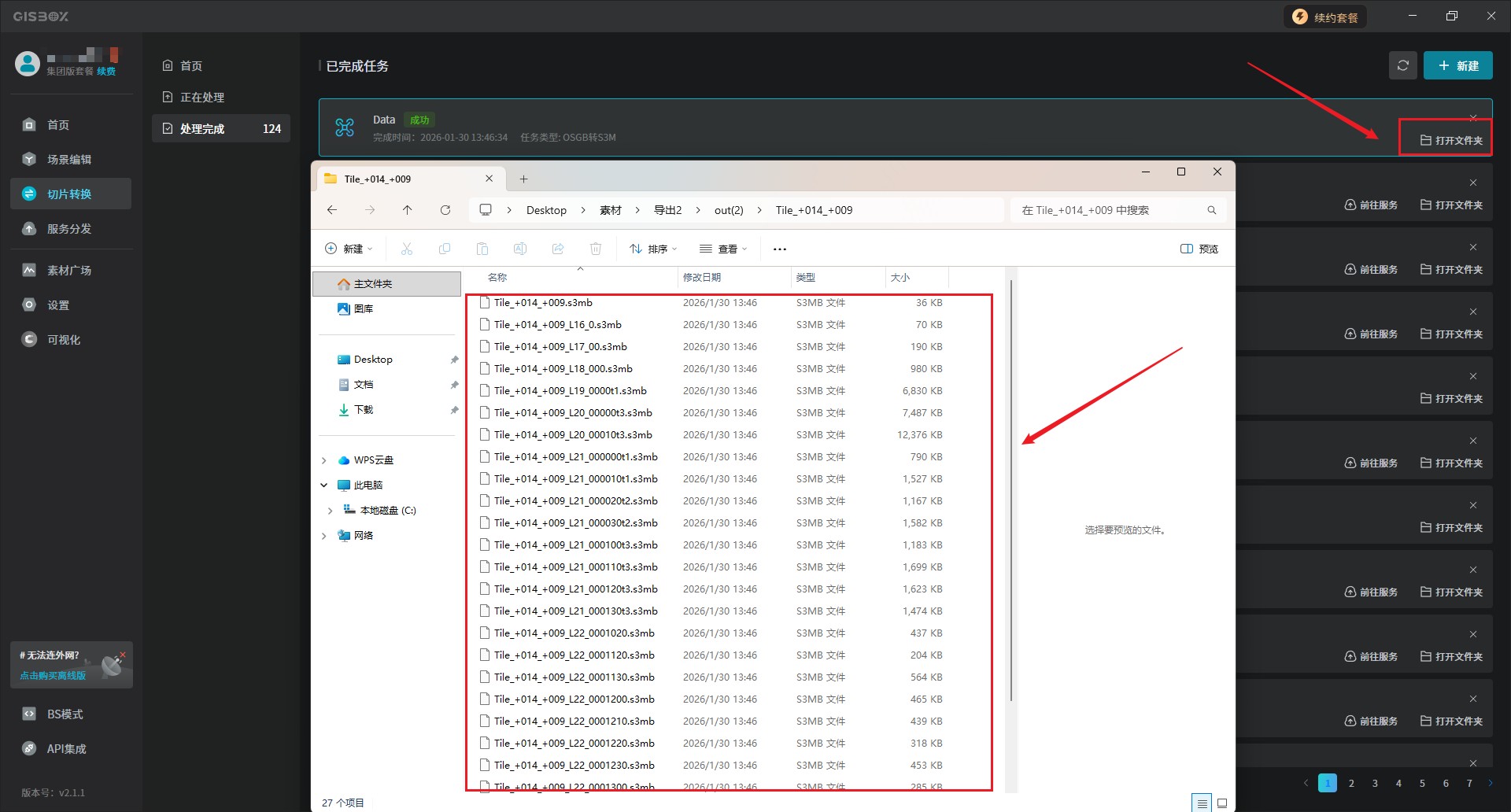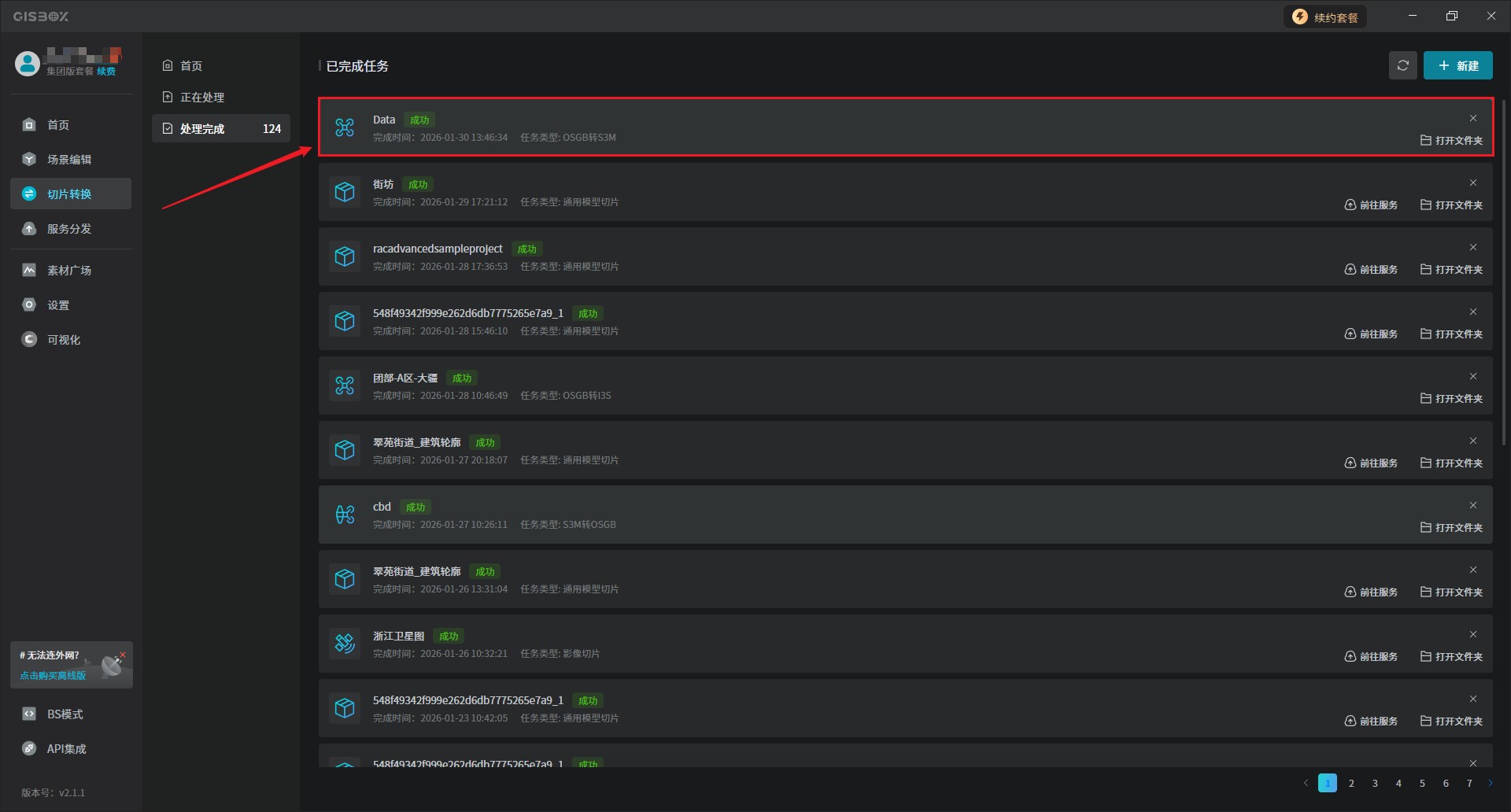 2、转换成功后,就会跳转至已完成列表中,并在列表下会显示一条“OSGB转S3M”转换成功的记录。