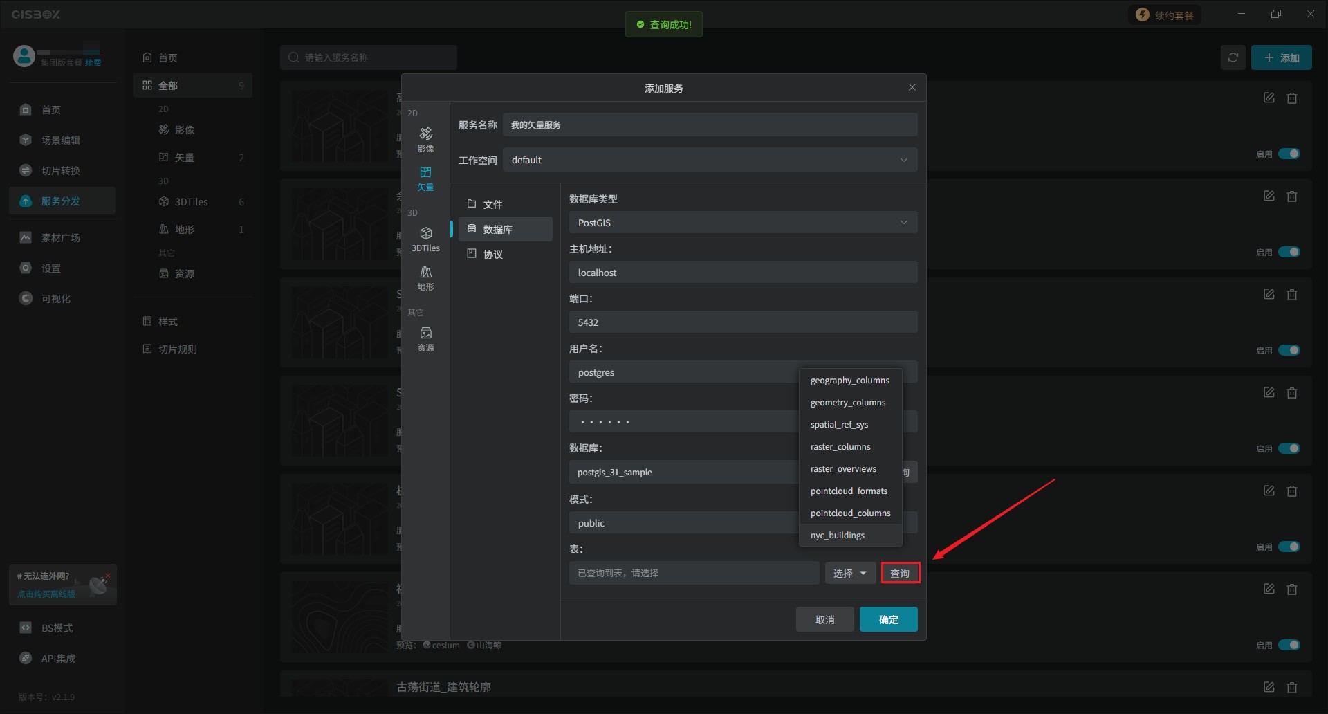 1、首先我们先检查一下数据库是否连接成功,这一步还是很关键的。如果没有连接成功,后面GISBox将无法获取到GIS数据库中的数据,从而后续操作无法进行。