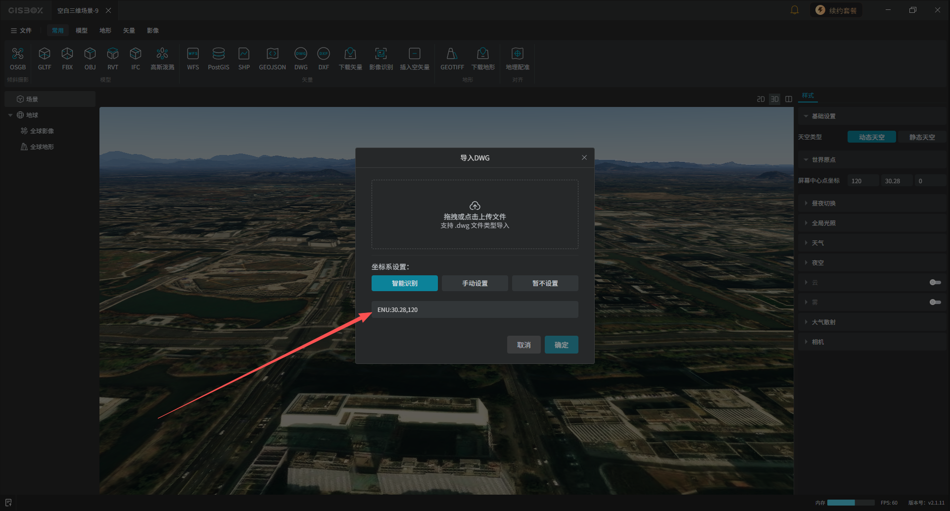 导入场景时您的DWG文件有坐标系的话这里会自动识别