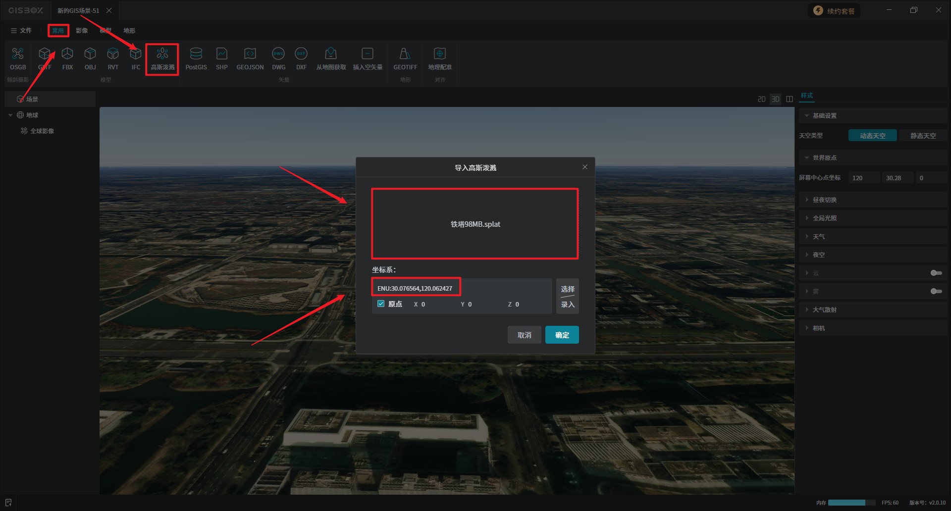 创建成功后会自动打开该场景项目,在场景界面上方的Tab栏中选择“常见”模块,点击“高斯泼溅”,此时界面会出现一个“导入高斯泼溅”的弹框,并将本地的高斯泼溅格式文件导入进去,由于示例的高斯泼溅模型有对应的位置坐标,在坐标中直接输入即可。如图所示: