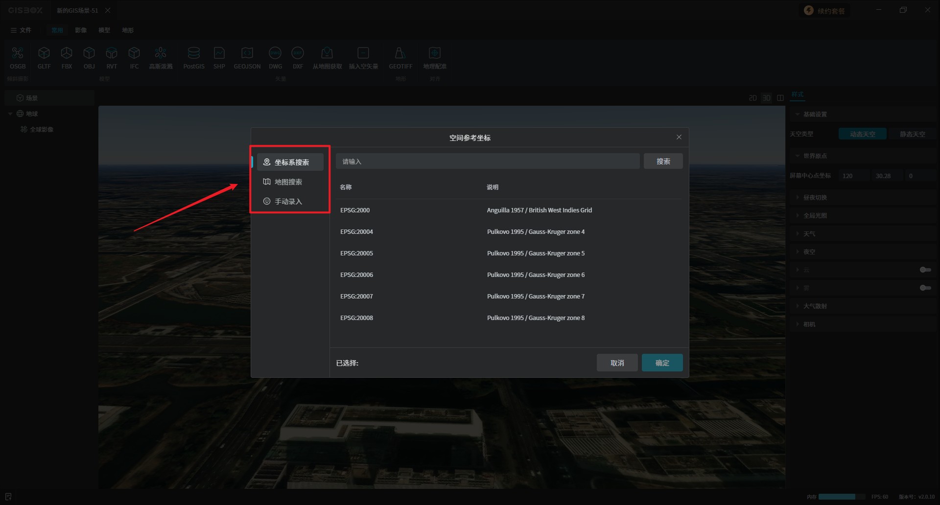 对于带有已知坐标系(如EPSG:4547)的模型,有三种方式进行获取,分别:坐标系搜索、地图搜索和手动录入。如图所示: