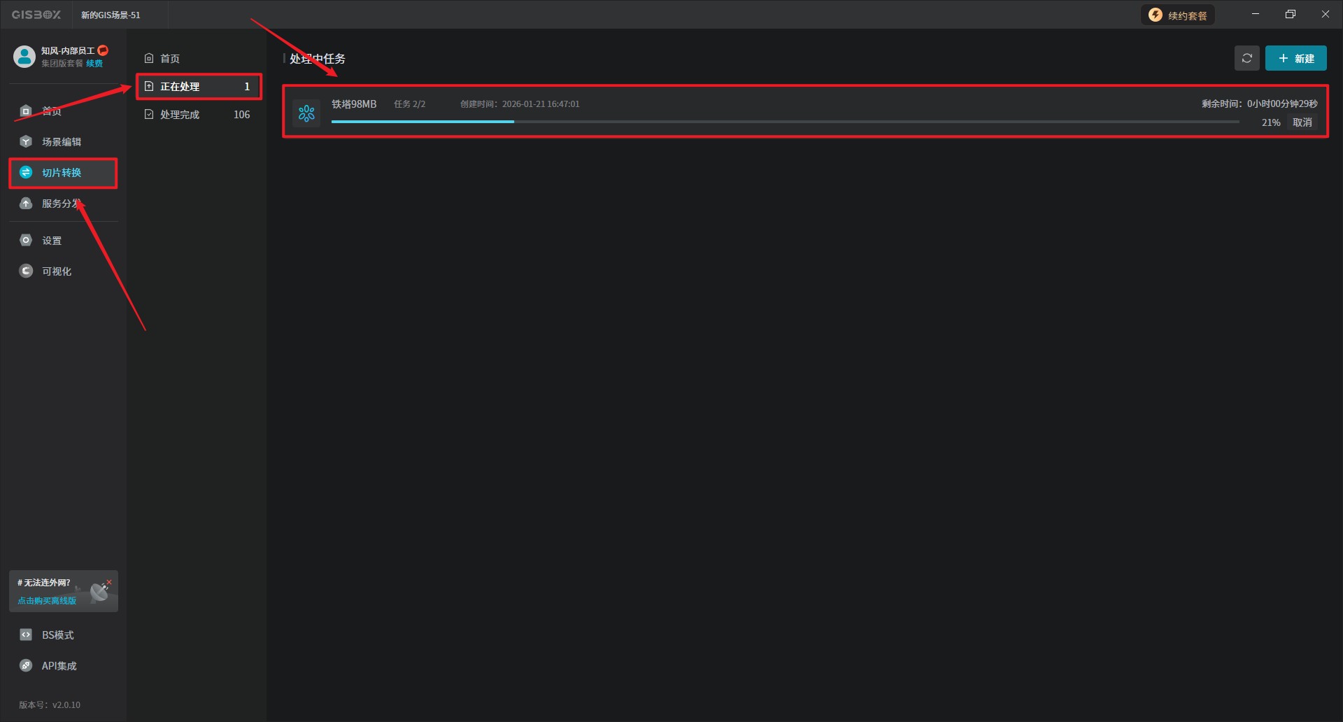 转换任务设置完成后,默认勾选了“同时发布成服务”时,点击“确定”按钮,高斯泼溅模型就会在“切片转换”的任务处理列表中进行转换,如下图所示: