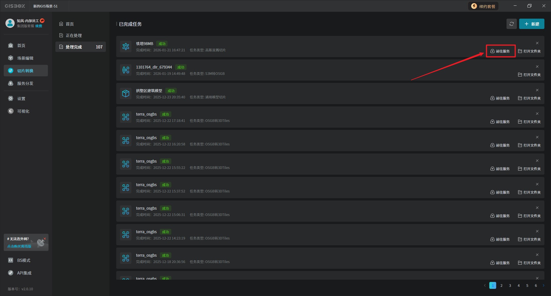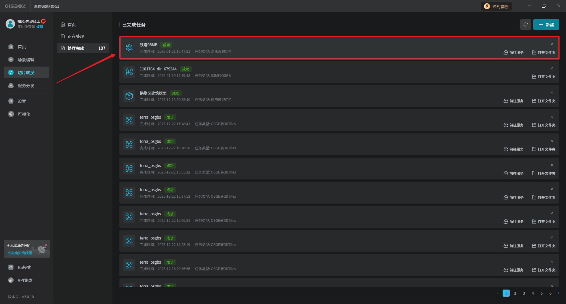 转换完成后,我们可以在“已完成列表”中找到转换成功的“高斯泼溅转3DTiles”,如下图所示: