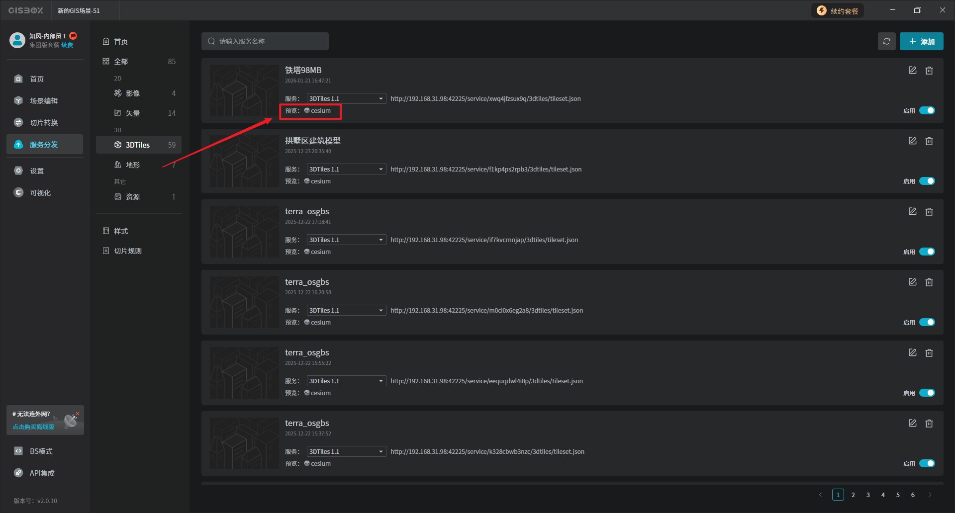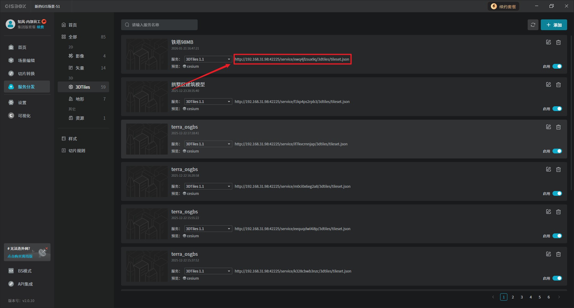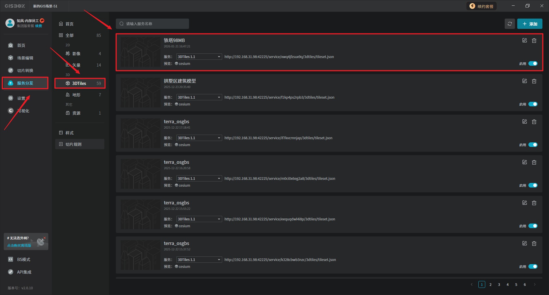 点击“前往服务按钮”就会立即跳转至“服务分发”界面,我们将会在“3DTiles”中看到已发布完成的服务,如下图所示: