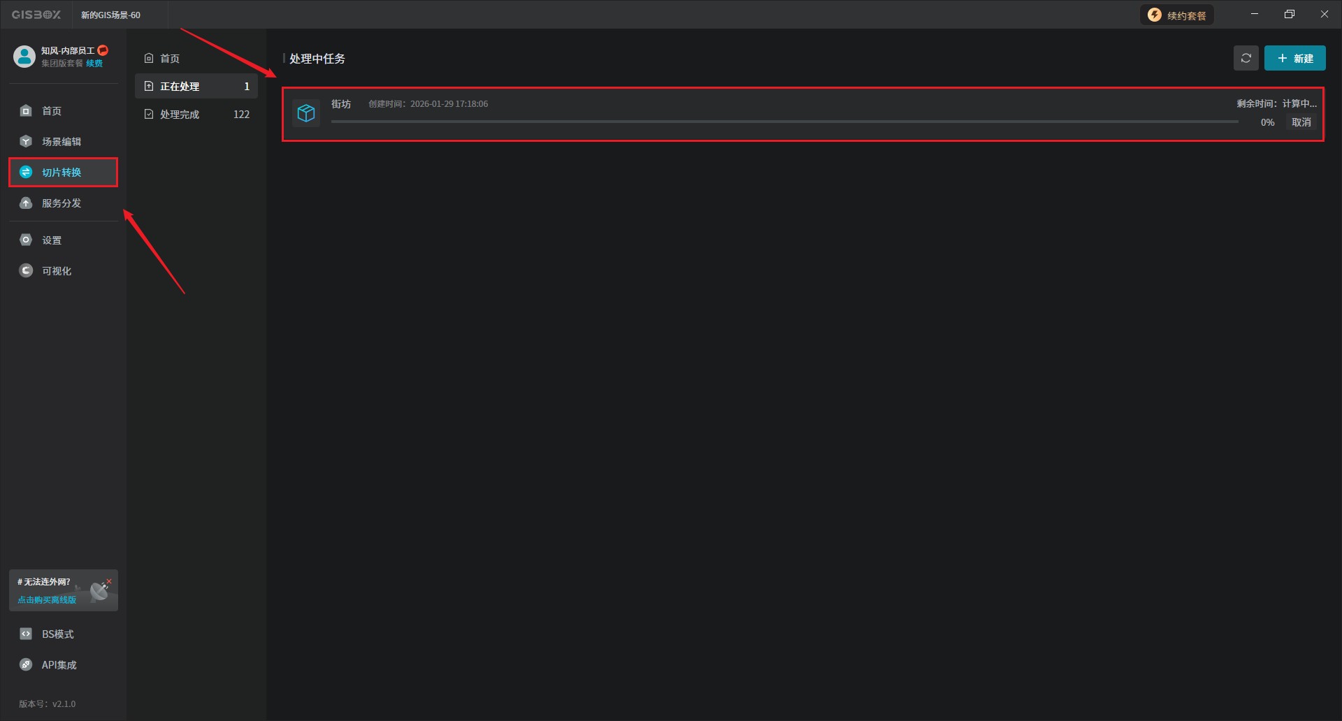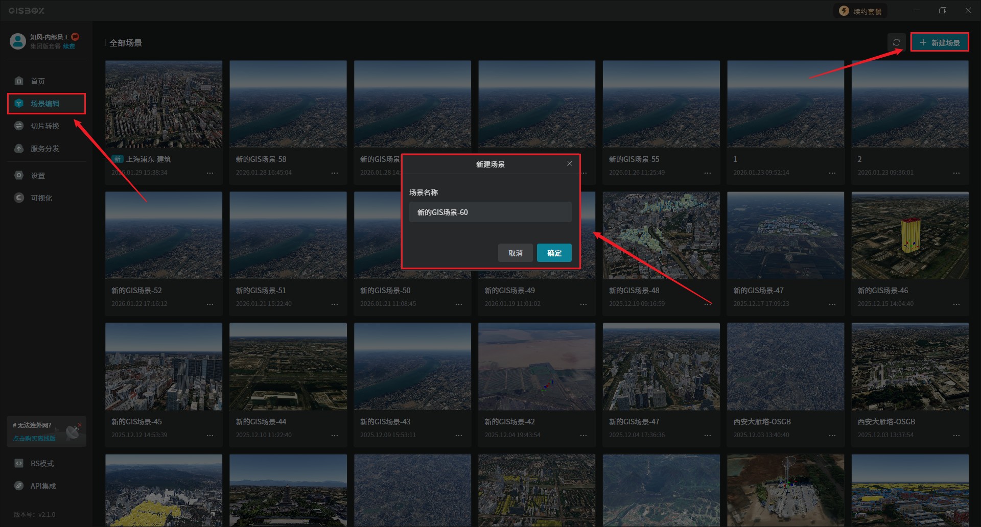 首先,打开GISBox软件,在场景编辑栏目中点击右上角的“新建场景”按钮来创建一个新的场景。