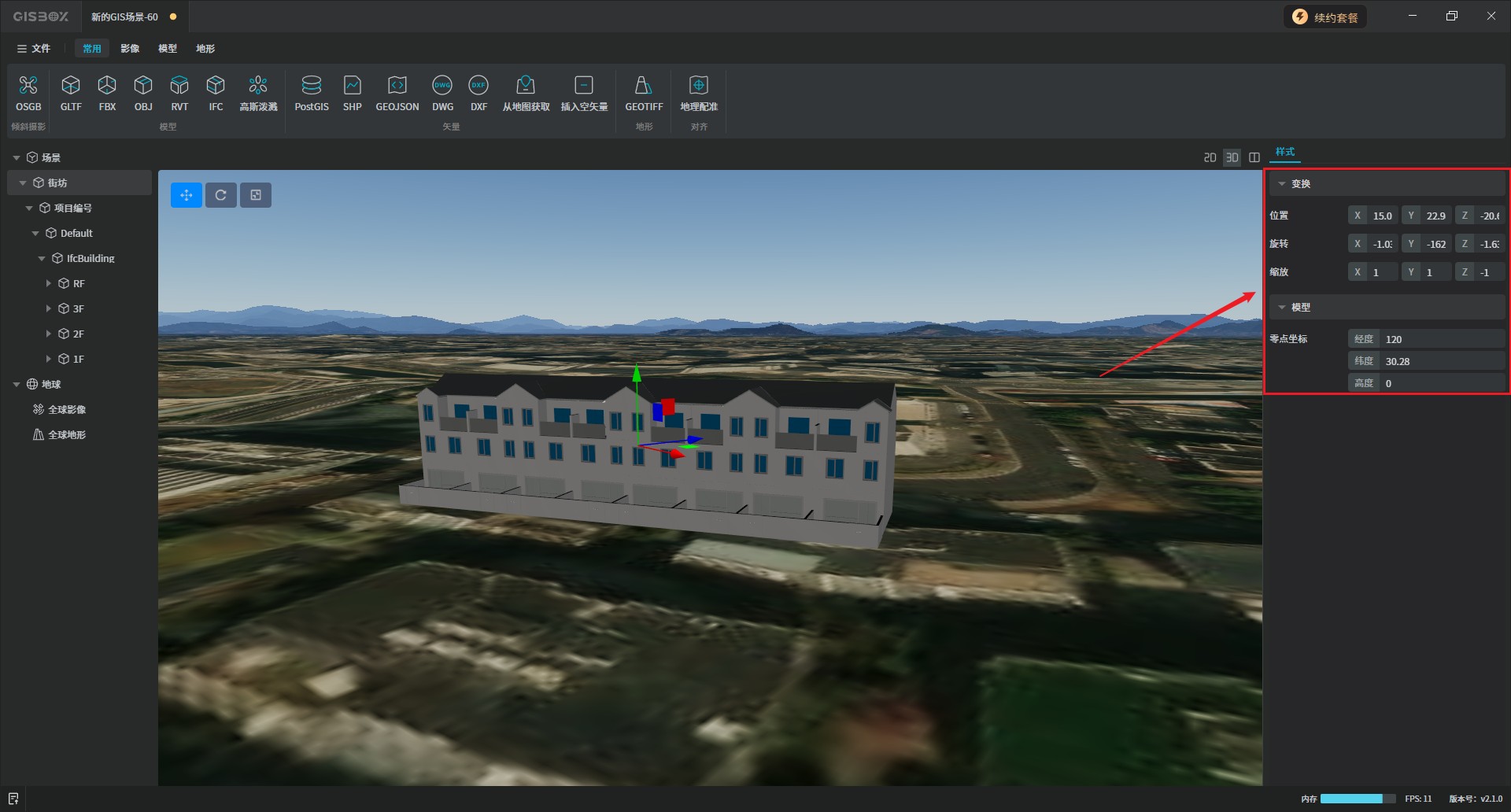 选中IFC文件模型后,可以在右侧“样式”中的"变换"中对模型的“位置”、“旋转”和“缩放”进调整。也可以在“模型”中调整模型的“零点坐标”,包括:“经度”、“纬度”和“高度”。如下图所示: