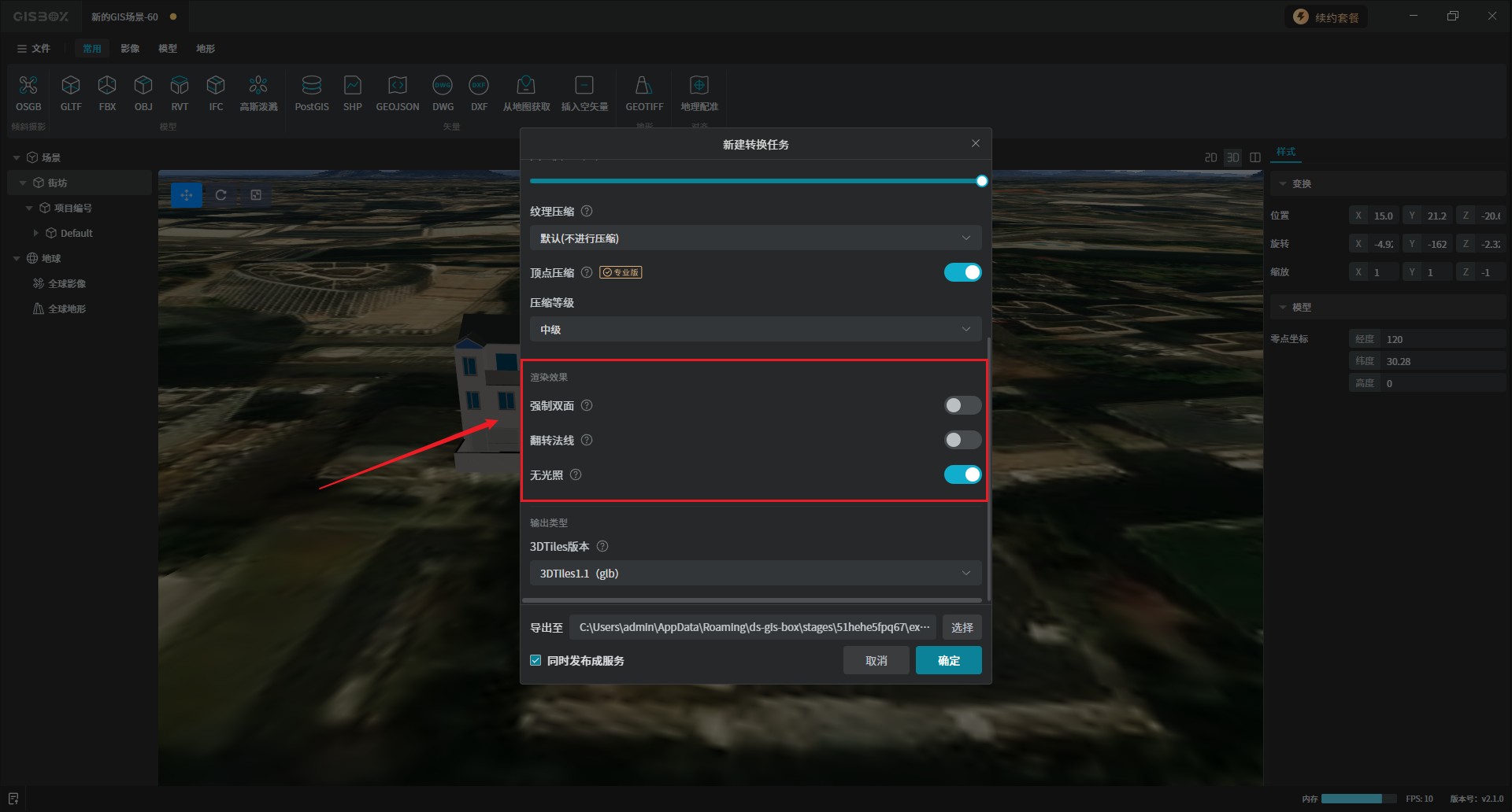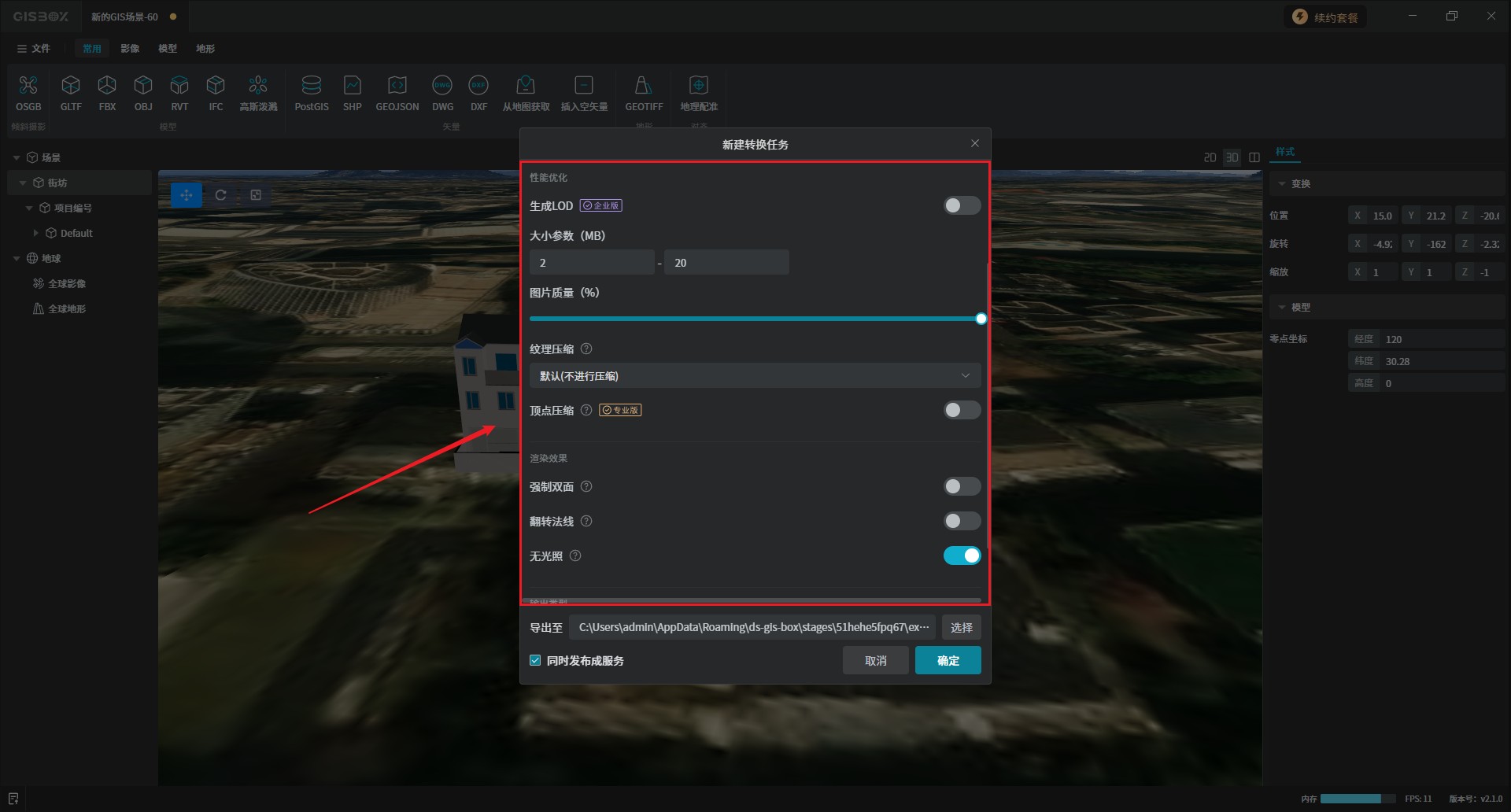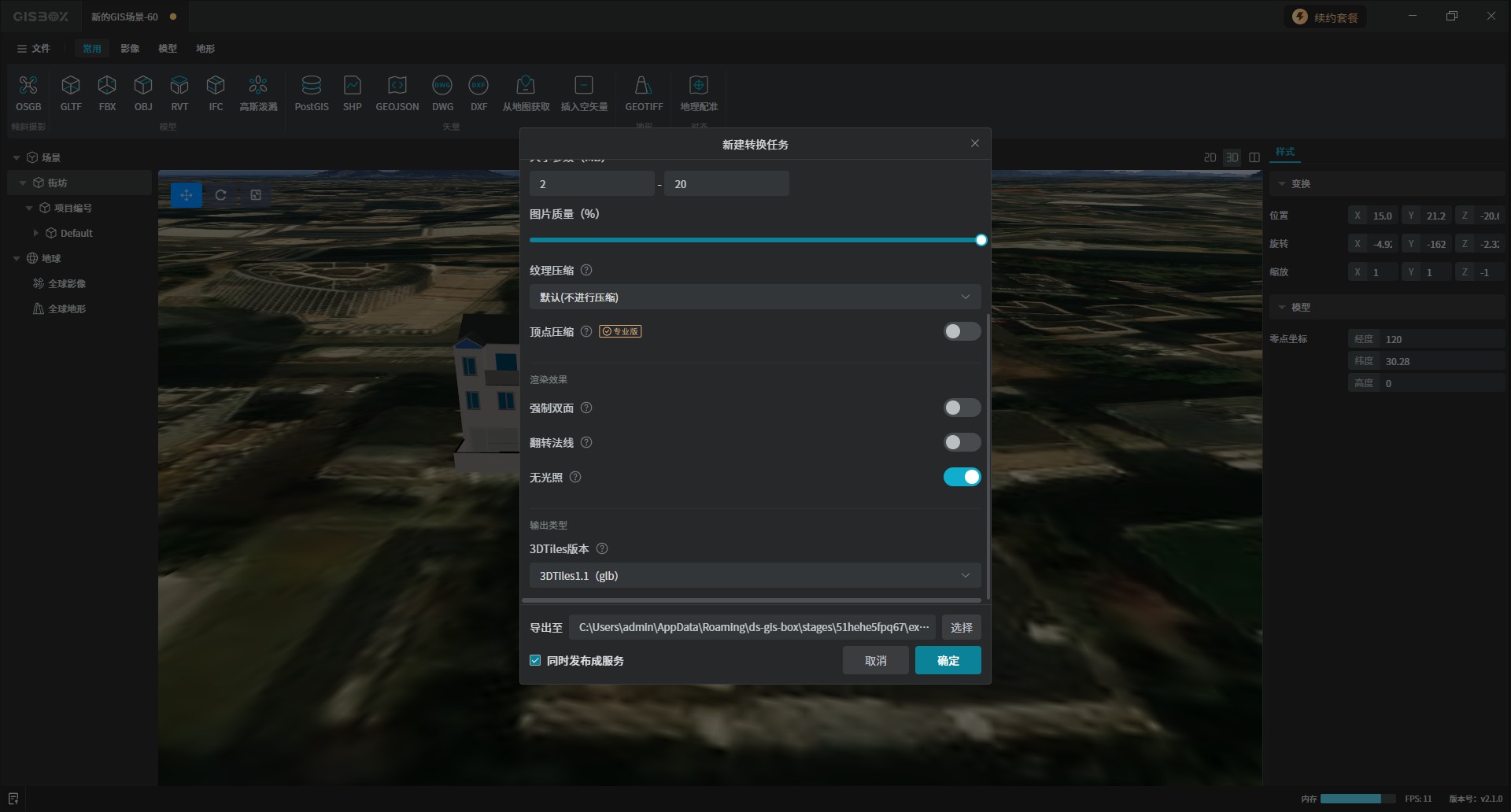 样式全部编辑完成后,点击IFC模型图层,再点击鼠标右键并选中“发布为3DTiles”,会弹出一个“新建转换任务”的窗口,如下图所示: