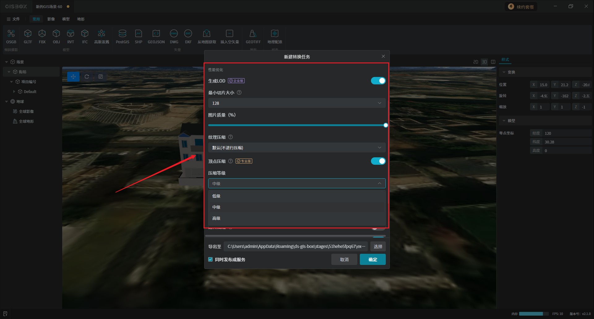 | 顶点压缩 | 压缩等级分为“低级”、“中级”和“高级”。压缩等级越高,压缩率越大。当压缩等级为“高级”时,数据精度损失会比较大,推荐使用“中级”。 |