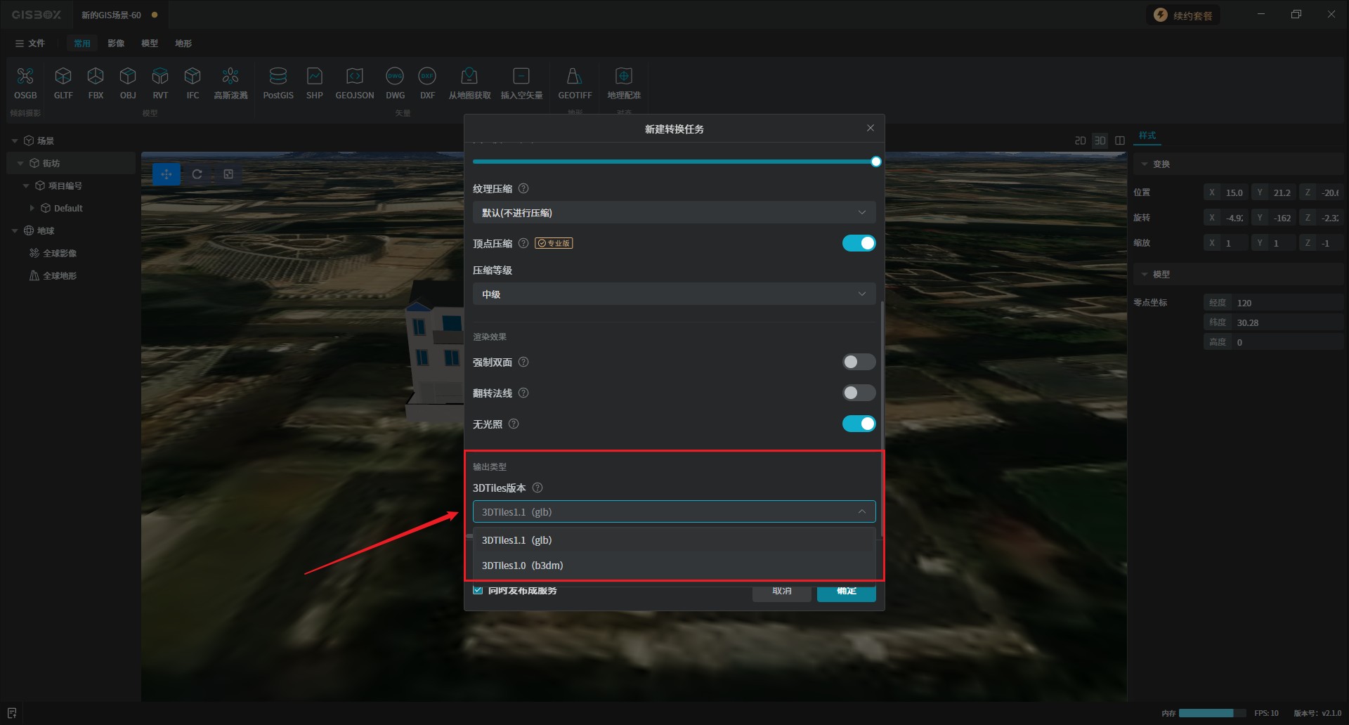 | 3DTiles版本 | 支持3DTiles1.0格式数据输出,即使用cesium自身的b3dm格式切片。 支持3DTiles1.1格式输出,即将几何、纹理及属性数据通过GLTF2.0的扩展机制存储到二进制GLB中。 |