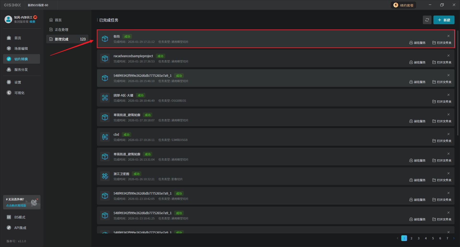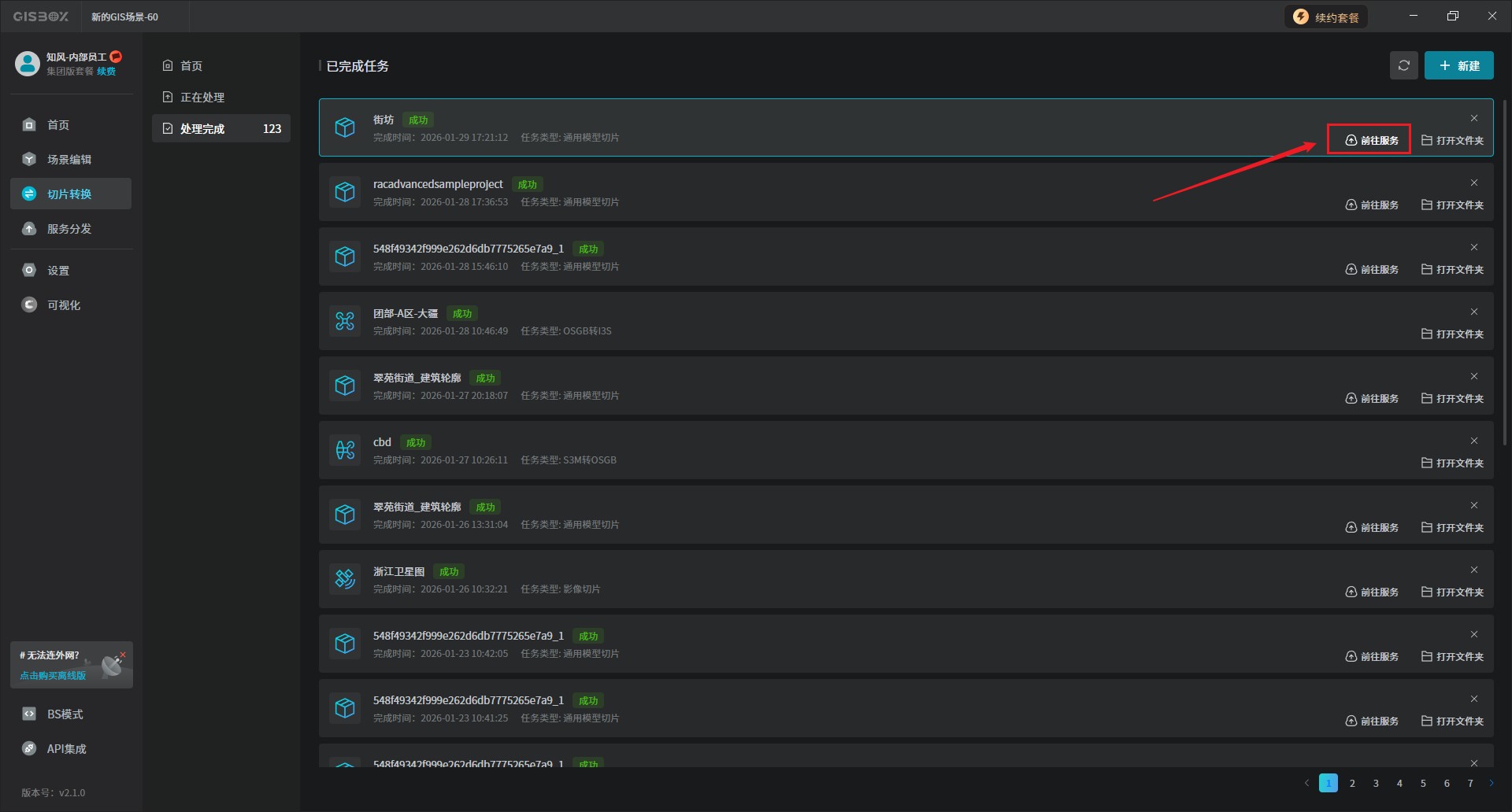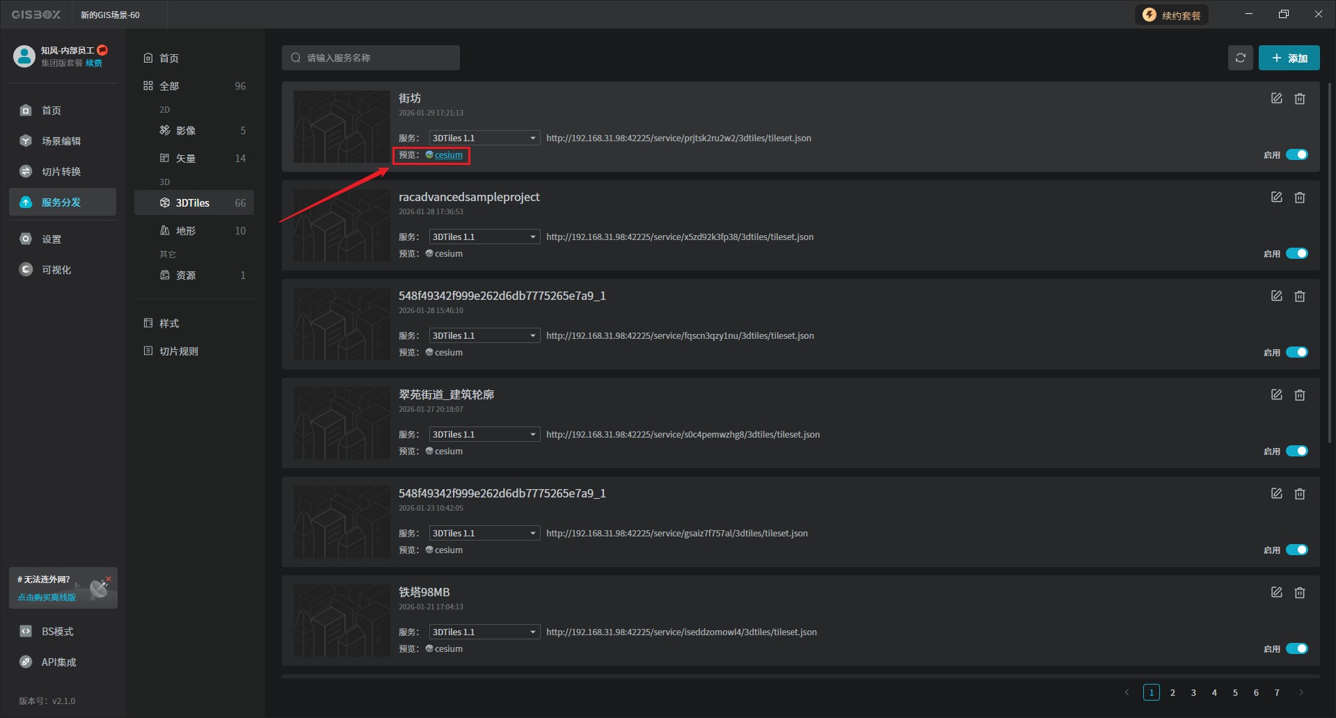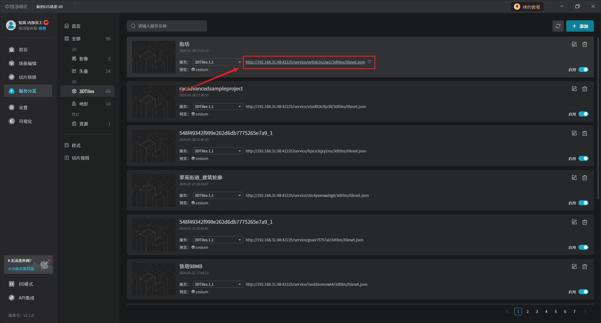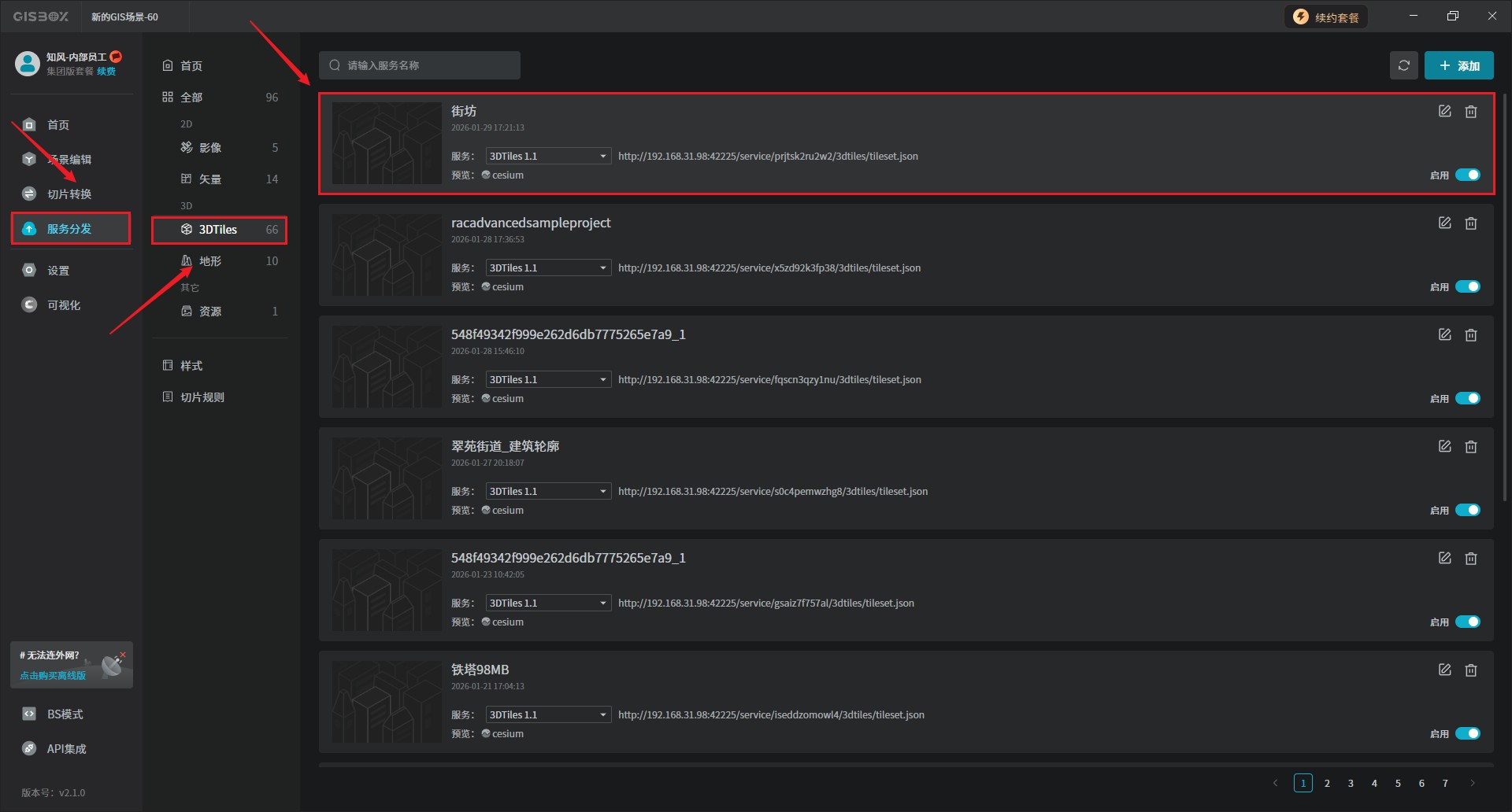 点击“前往服务按钮”就会立即跳转至“服务分发”界面,我们将会在“3DTiles”中看到已发布完成的服务,如下图所示:
