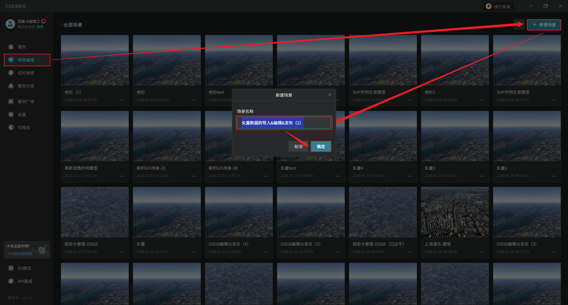 首先,在GISBox首页进入“场景编辑”模块,点击右上角“新建场景”,对该场景命名,点击“确定”,自动进入该新建场景。