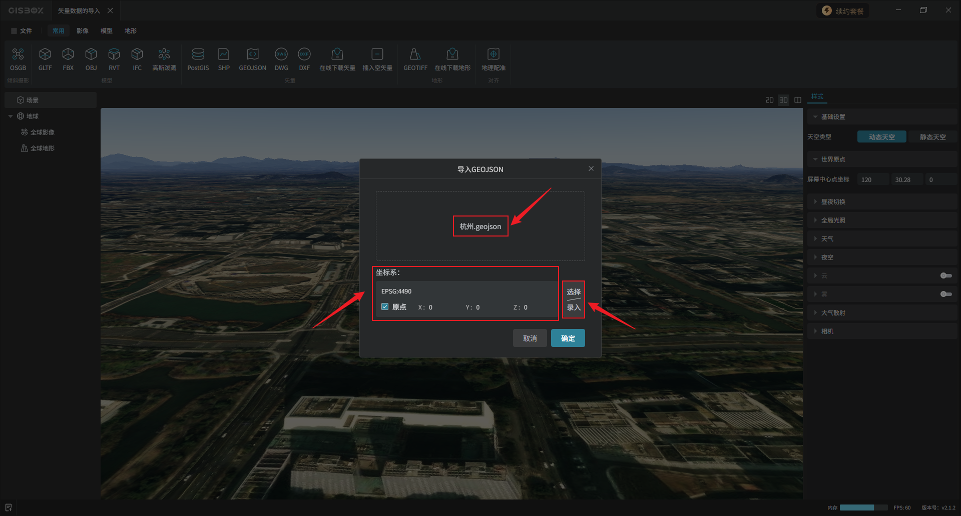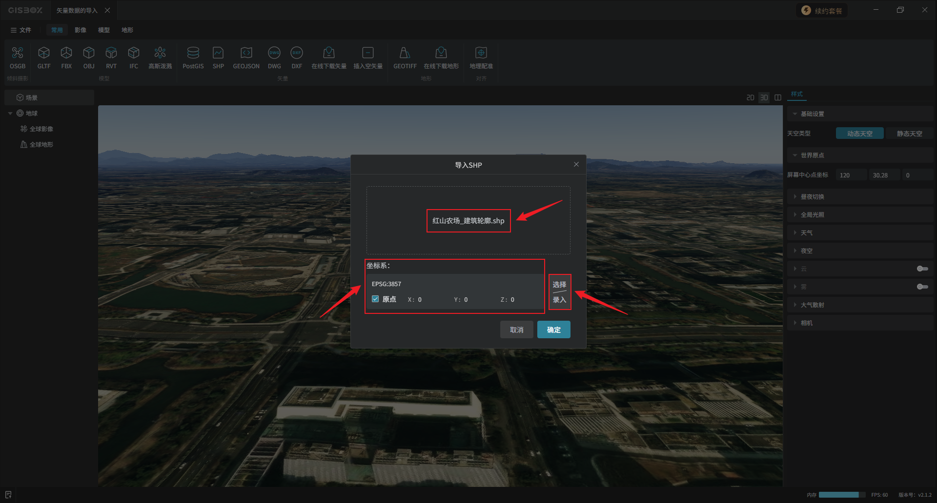 在“基础设置”设置项,可以设置矢量模型的绝对坐标,保证无论在哪个平台中浏览该模型都能够定位到准确位置。点击“选择/录入”,可以通过三种方式录入坐标。