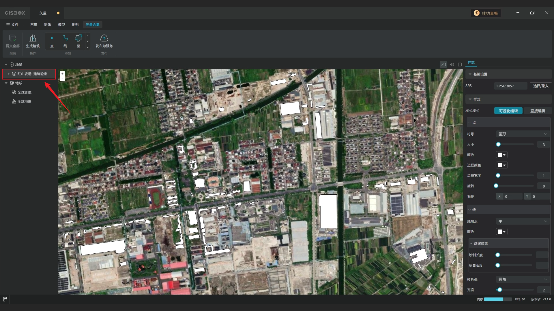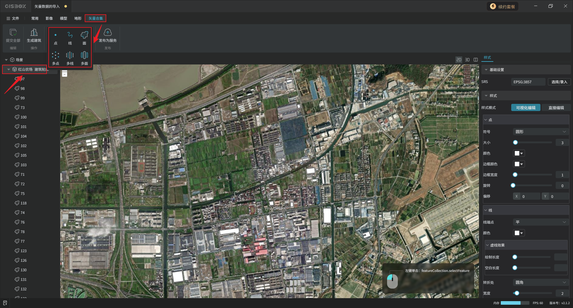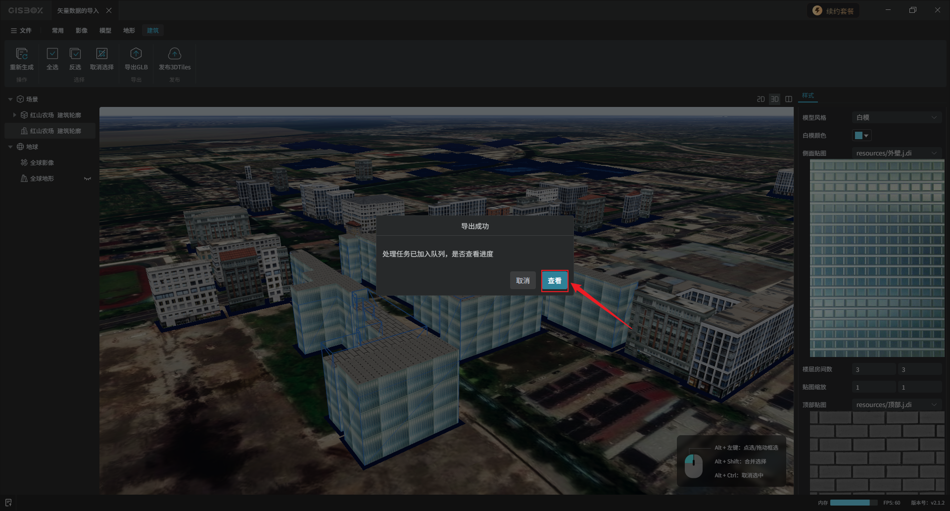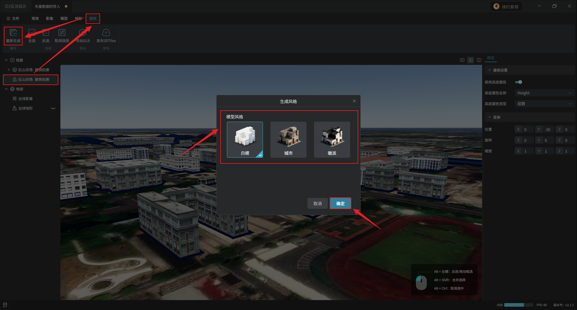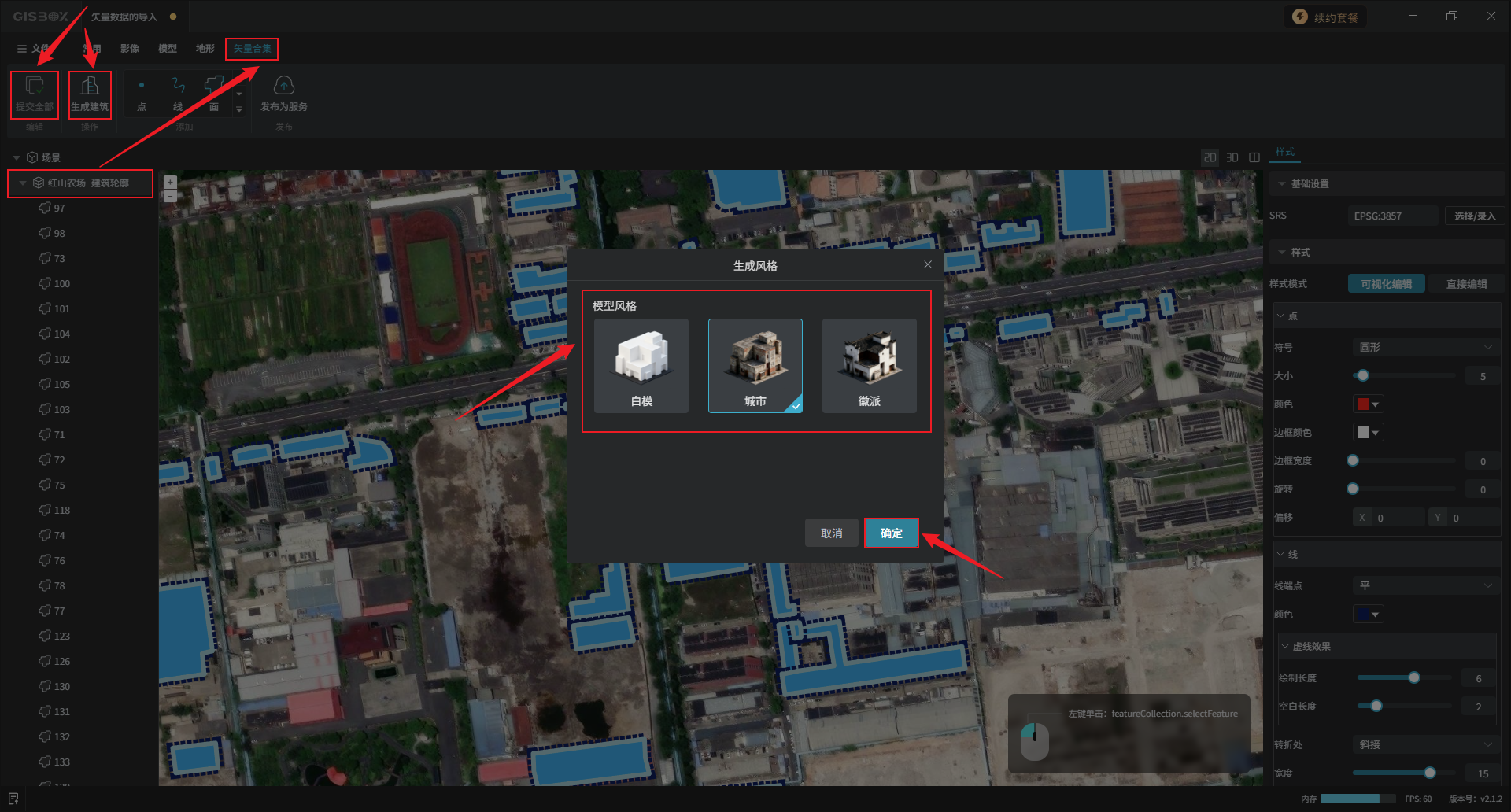 编辑完成后,选中矢量合集图层,在“矢量合集”Tab标签下,依次点击“提交全部”、“生成建筑”,选择想要的模型风格,点击“确定”。