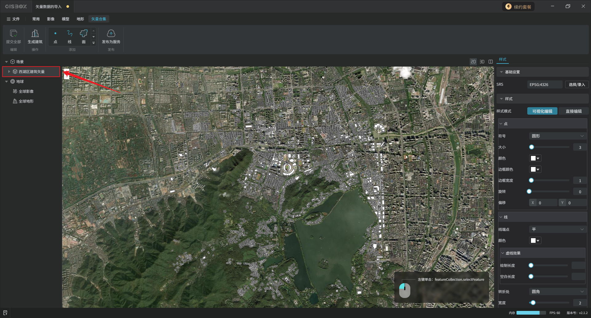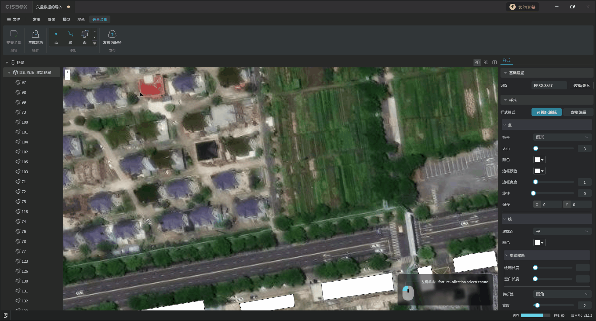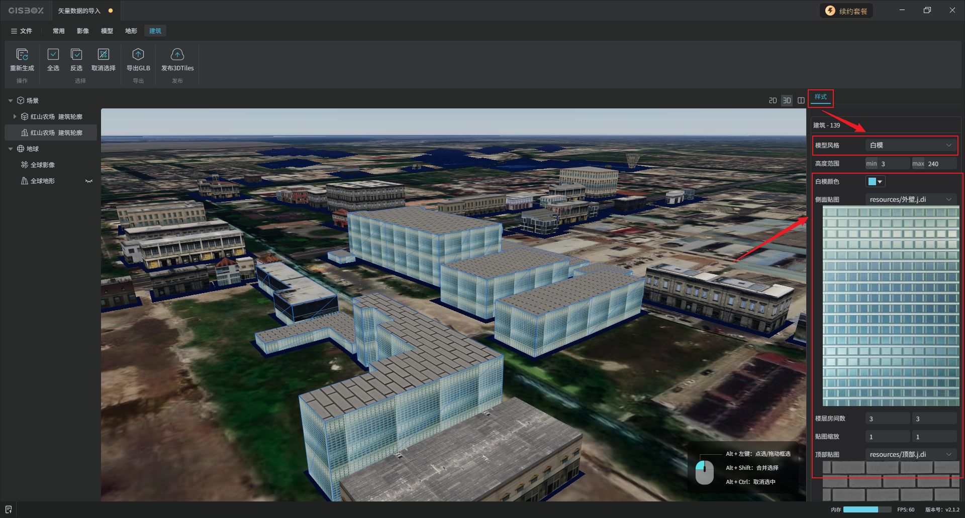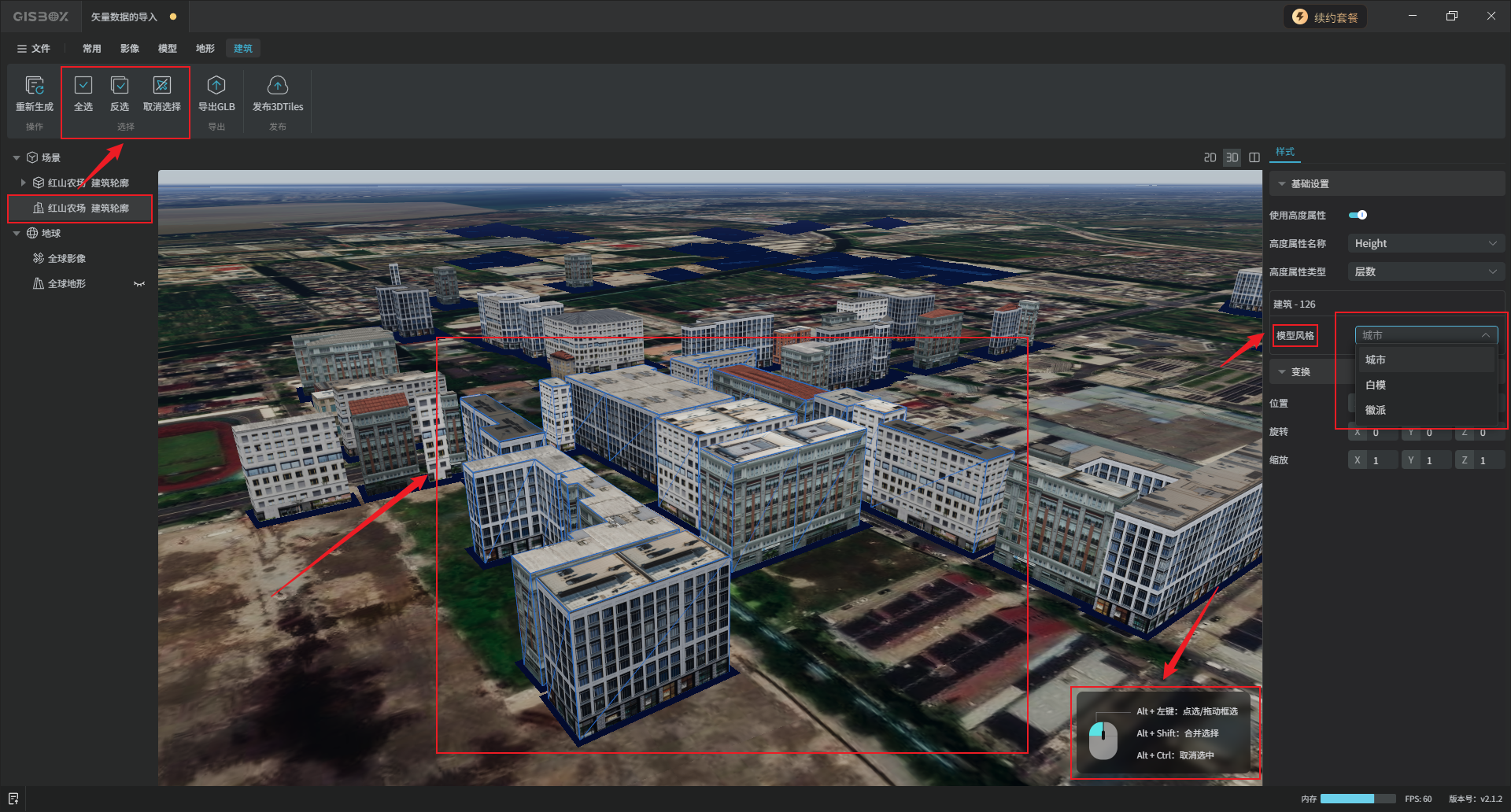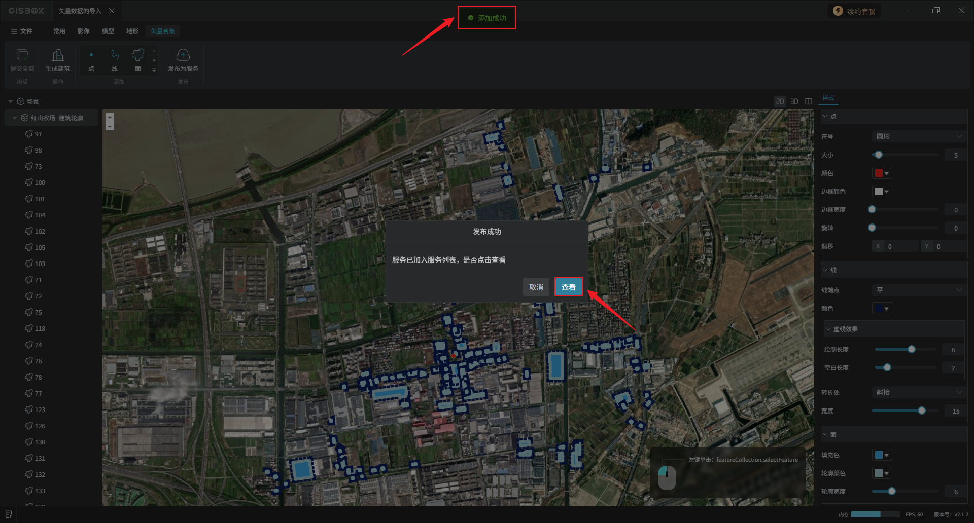 编辑完成后,选中矢量合集图层,在“矢量合集”Tab标签下,依次点击“提交全部”、“生成建筑”,选择想要的模型风格,点击“确定”。