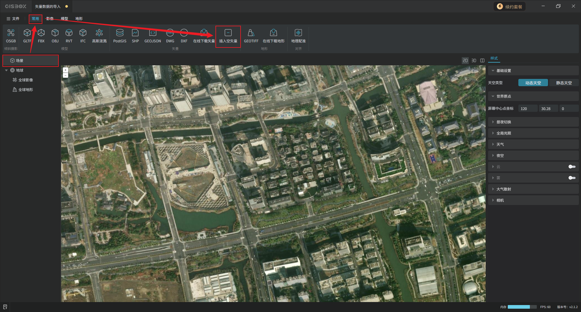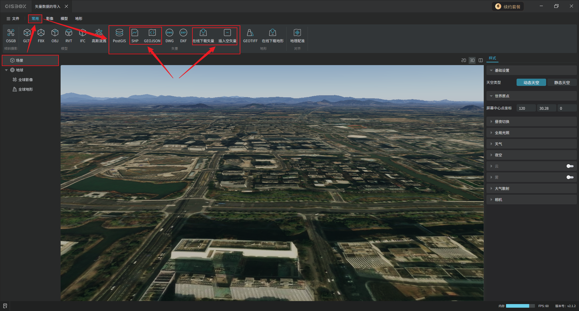 选中“场景”图层,“常用”Tab标签下,“矢量”功能区,有七种矢量数据导入方式,本文介绍“SHP”、“GEOJSON”、“在线下载矢量”和“插入空矢量”四种方式。