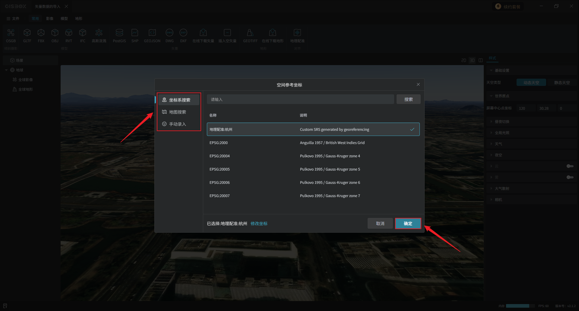 可以通过“坐标系搜索”、“地图搜索”、“手动录入”三种方式设置“空间参考坐标”,按需选择即可。