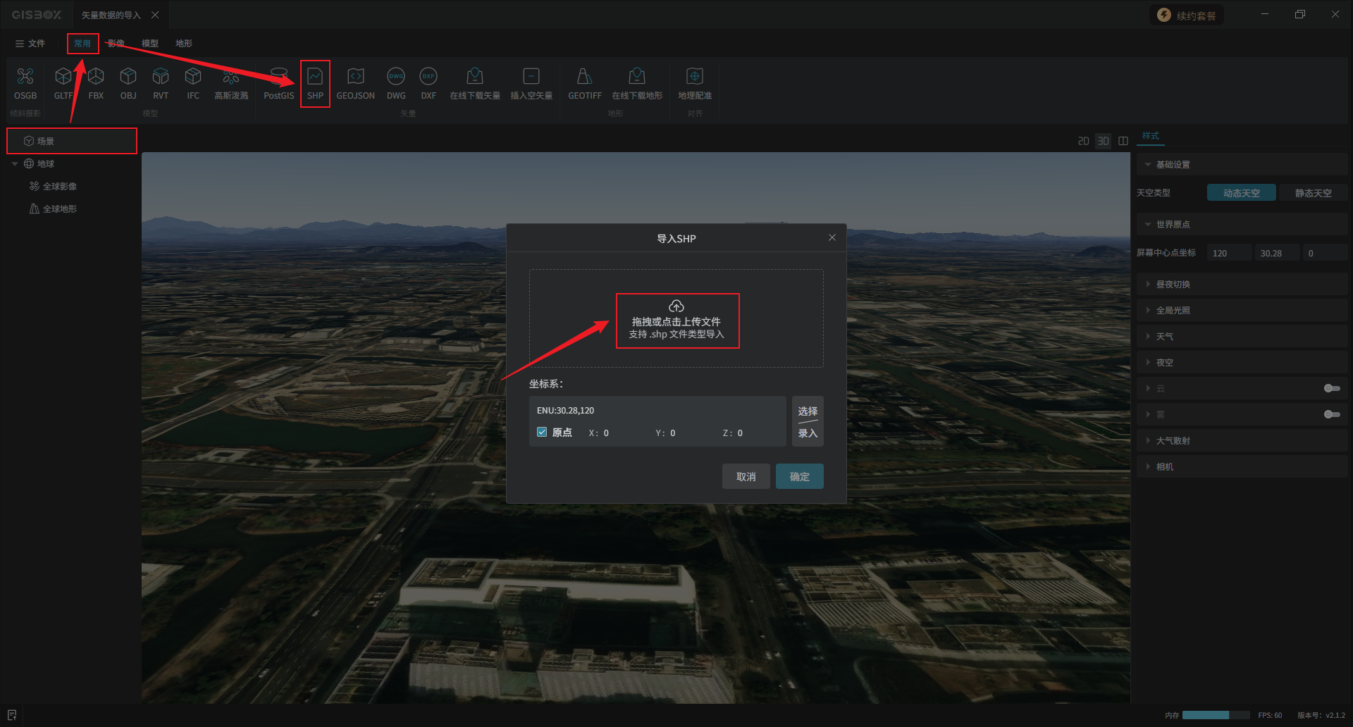 选中“场景”图层,点击“常用”Tab标签下的“SHP”选项,在“导入SHP”弹窗中,拖拽或点击上传文件。