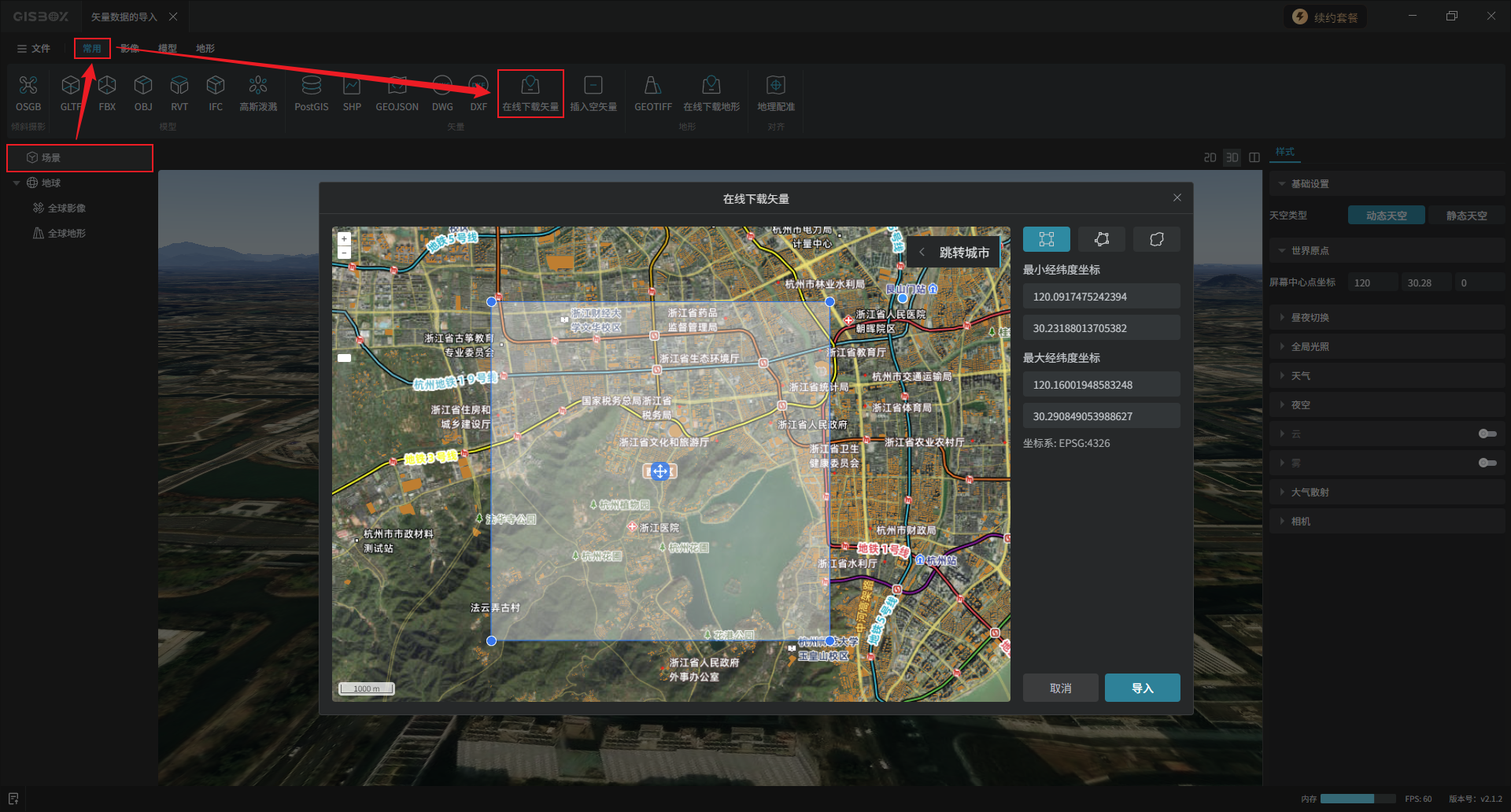 选中“场景”图层,点击“常用”Tab标签下的“在线下载矢量”选项。