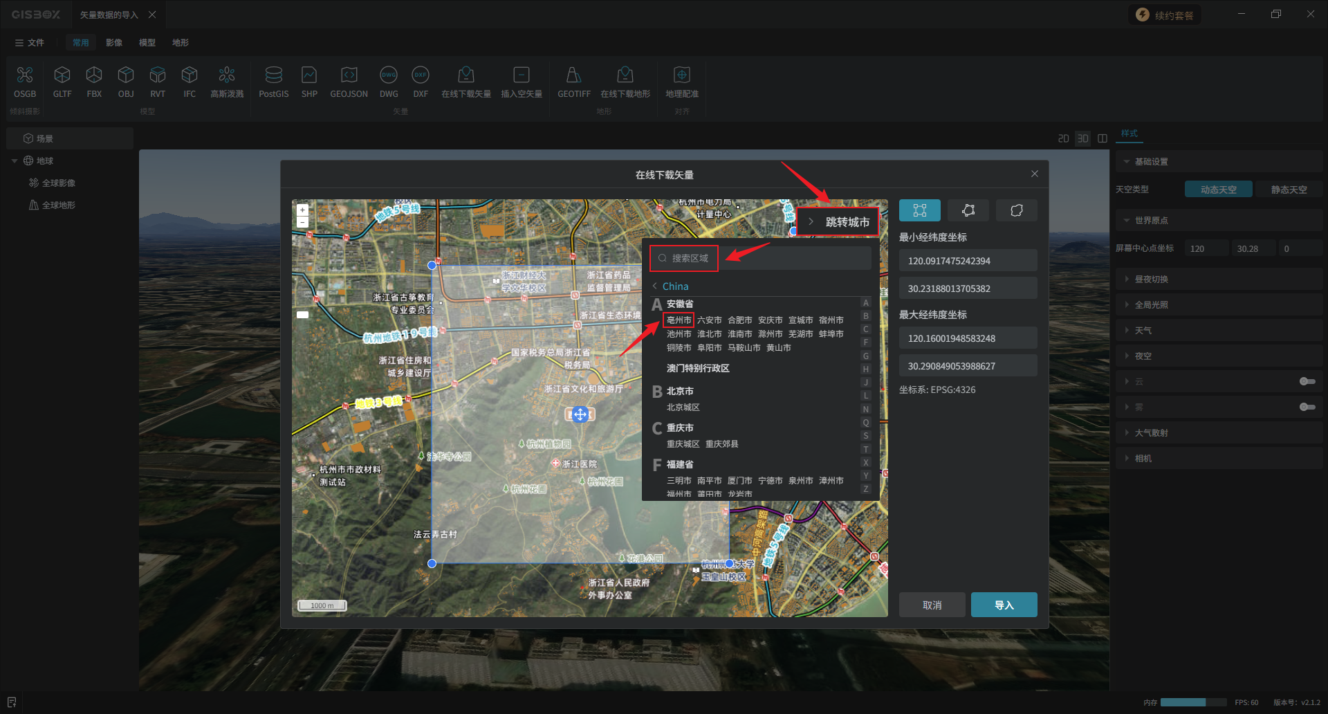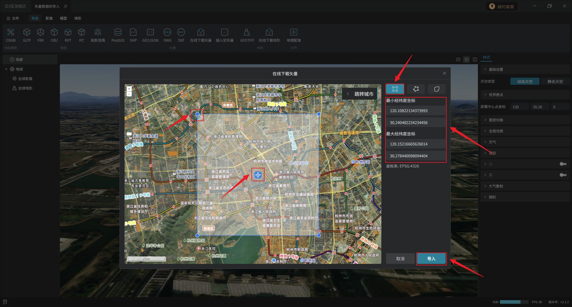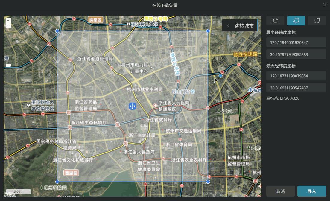 矩形框选:光标放置蓝色矩形框中心的点位可以拖动框选区域,拖动矩形框顶点可以调整框选范围,在坐标输入框可以直接输入框选范围的最小最大经纬度坐标。框选完成后,点击“导入”。