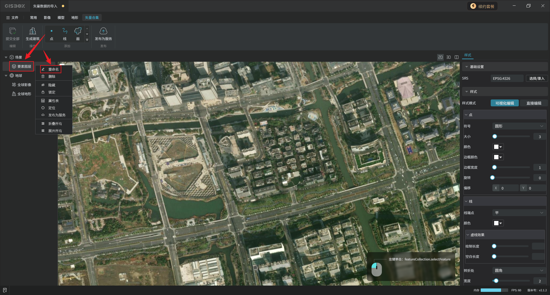左侧图层面板会直接出现一个名为“要素图层”的矢量图层,鼠标右键点击该图层,可以对其“重命名”。