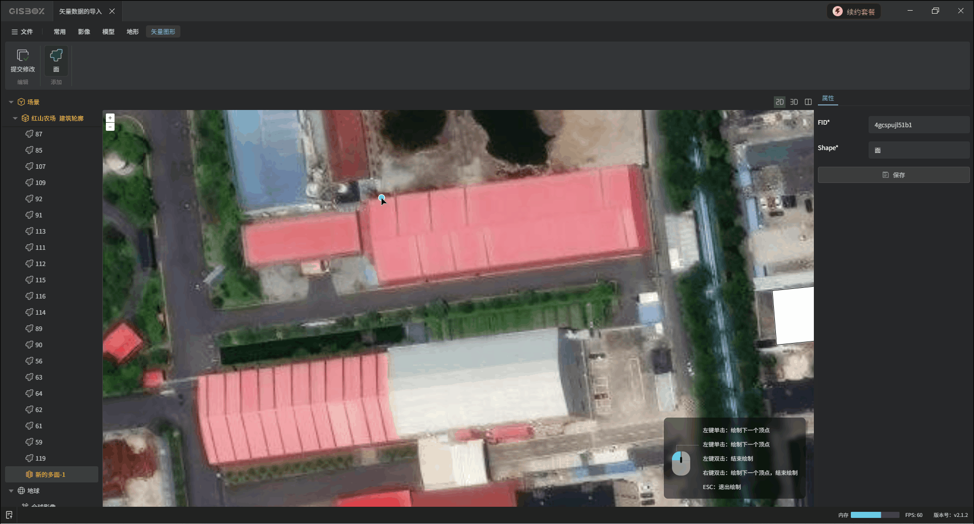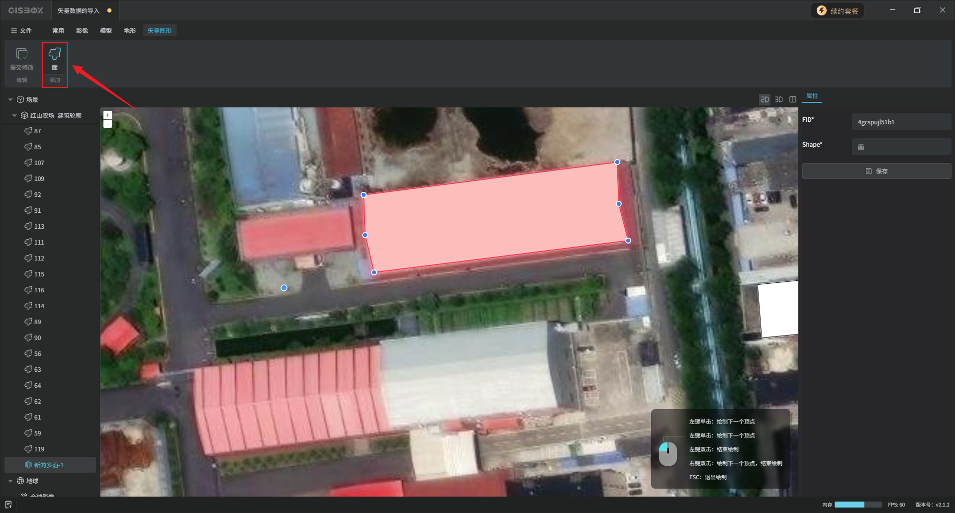 添加成功后光标下就会产生一个蓝色圆点,根据右下角的操作提示,框选矢量区域。第一个区域框选完成后,可以继续框选下一个区域,同样也可以调整区域边线细节。