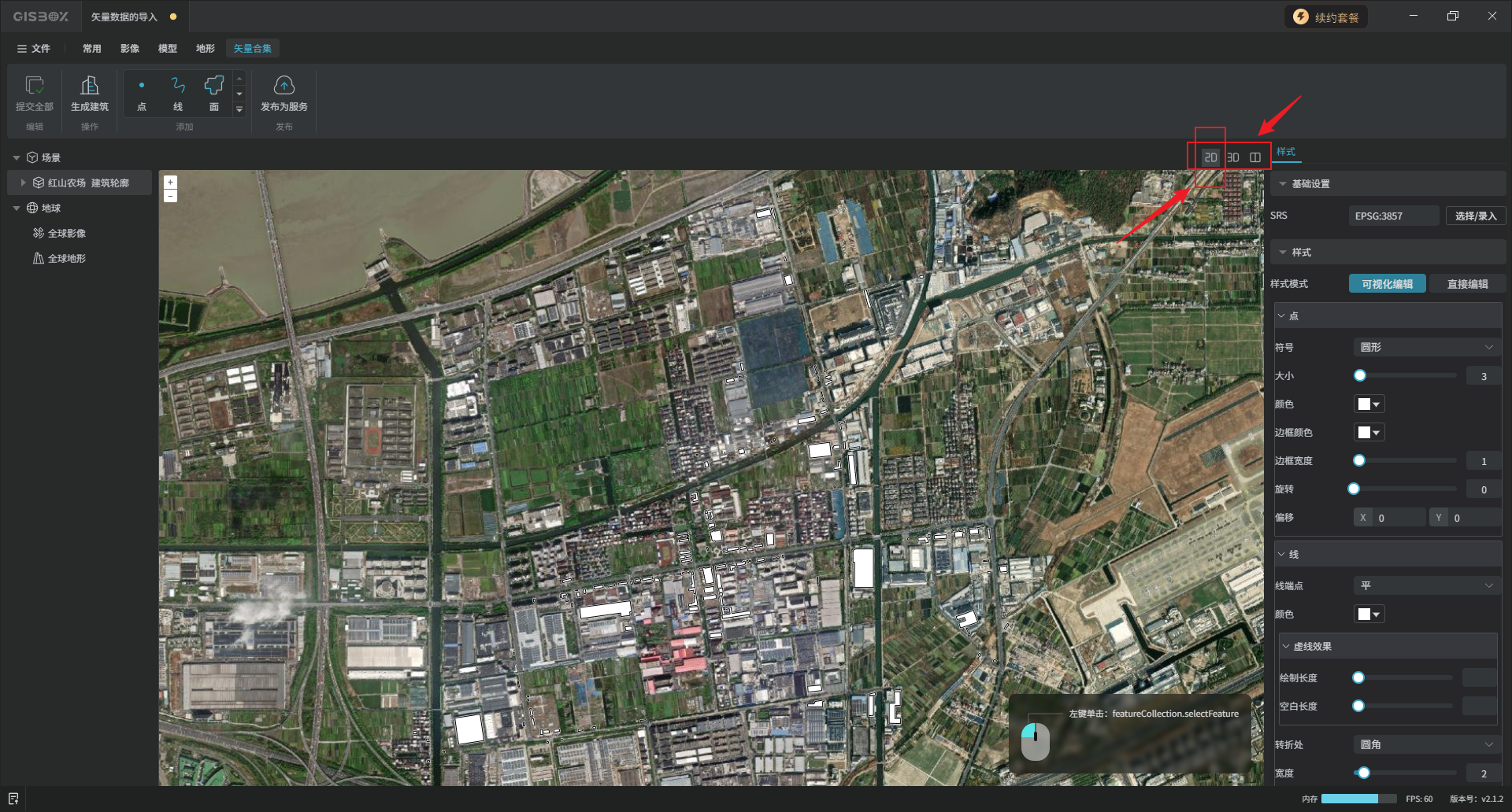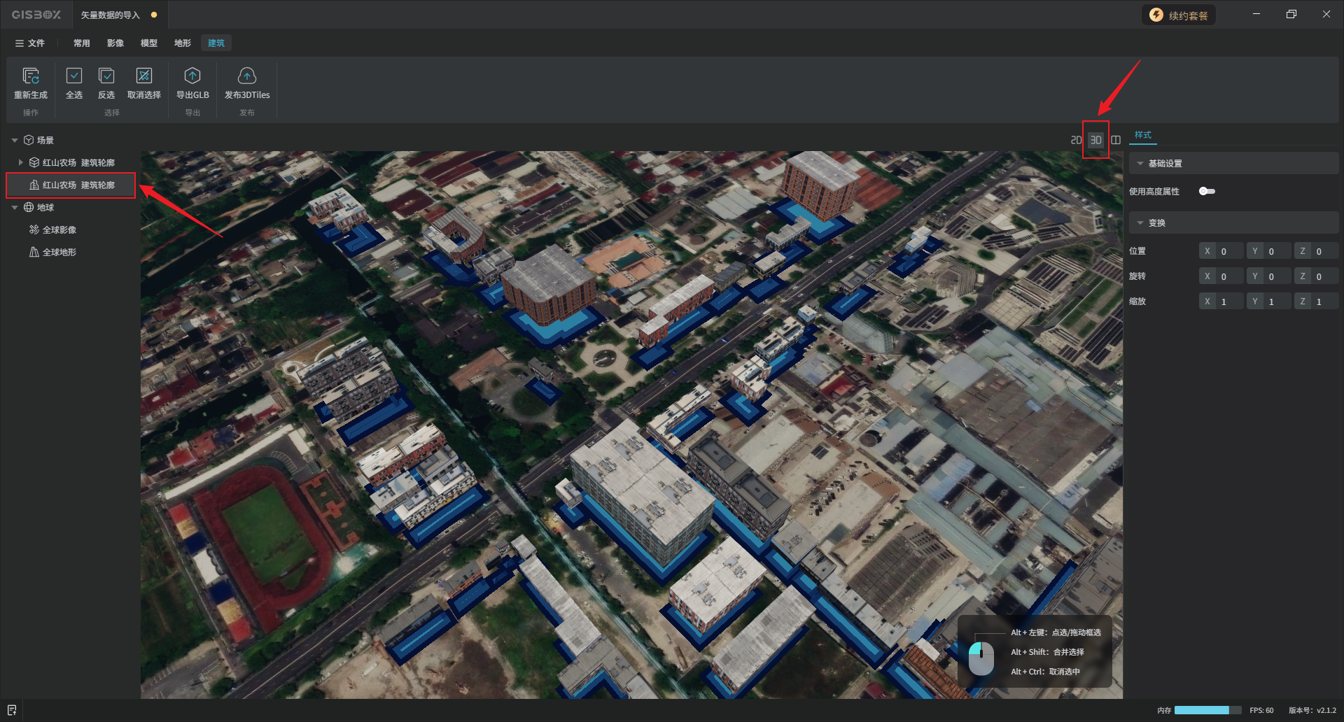 建筑生成后,左侧图层面板会出现一个与矢量合集图层同级的建筑图层。在画面右上角将视图切换至“3D”模式。