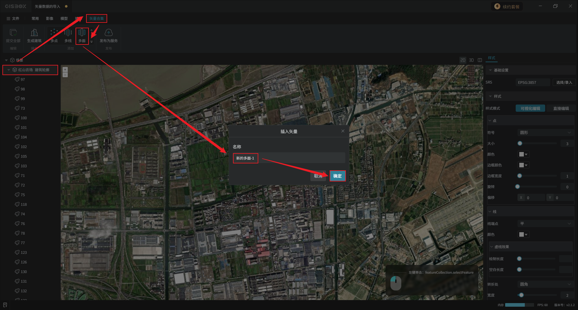 接下来“多面”为例介绍具体的操作,点击“多面”选项后,在插入矢量弹窗内,对该矢量图层命名,点击“确定”。