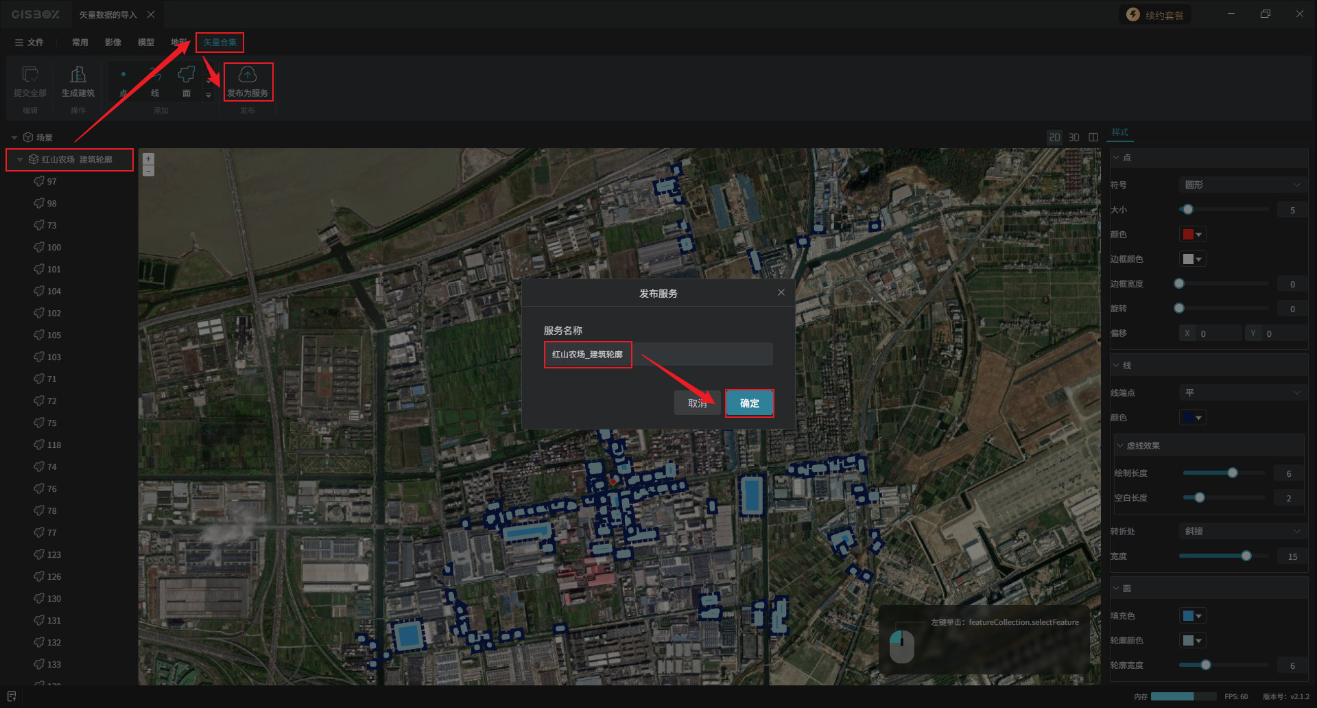 编辑好的矢量可以直接发布为服务。选中矢量合集图层,点击顶部工具栏中“矢量合集”Tab标签下的“发布为服务”,在弹窗中设置“服务名称”,点击“确定”。