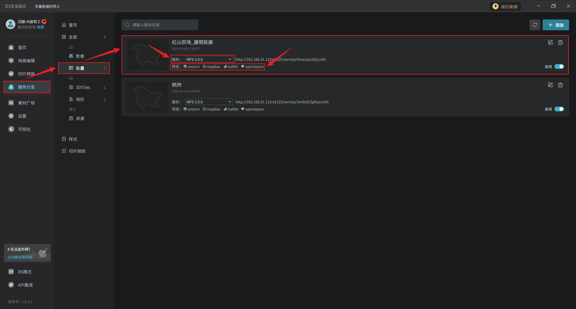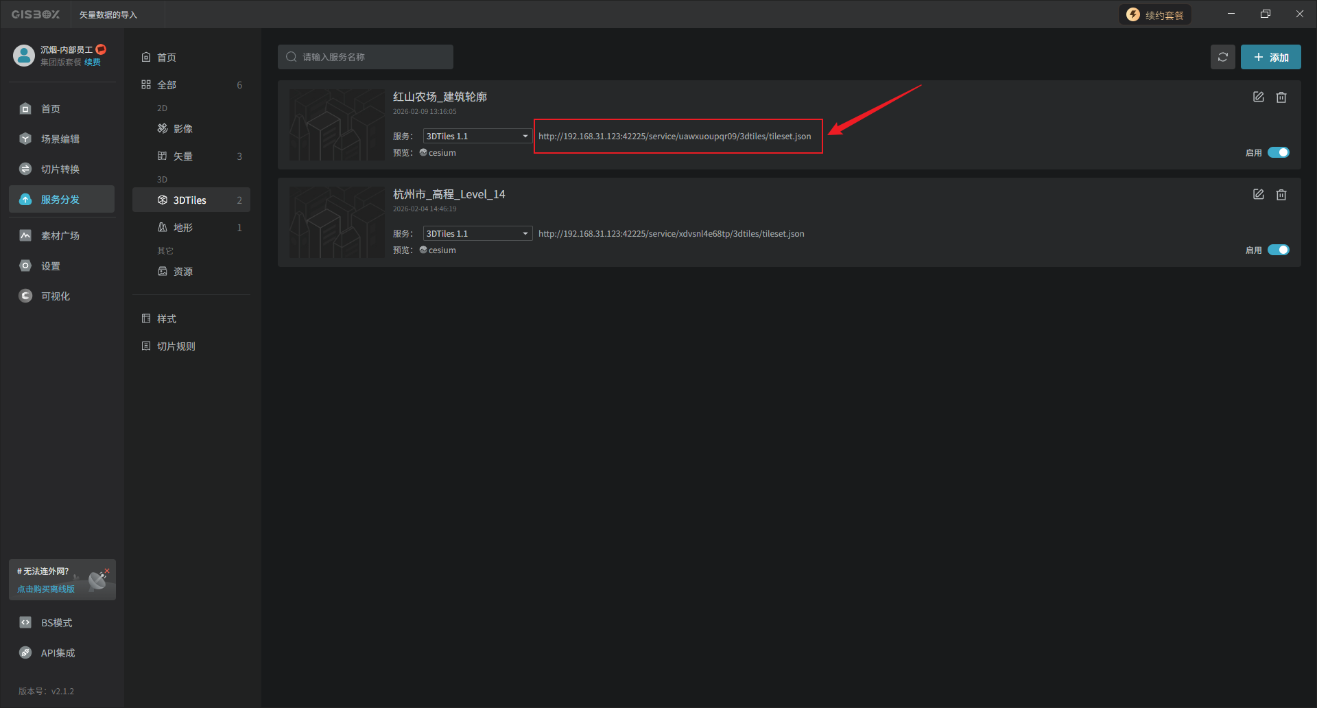 生成的“服务地址”可以被应用到cesium等GIS平台中,也可以应用于山海鲸可视化等包含GIS的数字孪生平台中。