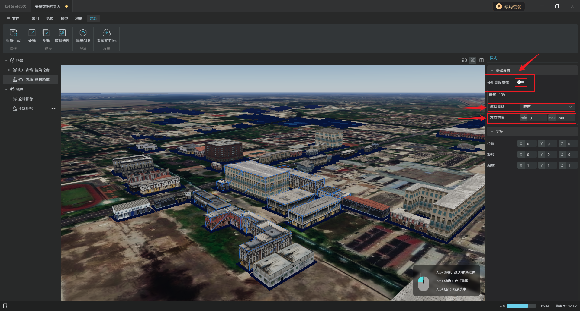 其中,选择“城市“风格,将“使用高度属性”关闭,可以调整建筑模型的“高度范围”。