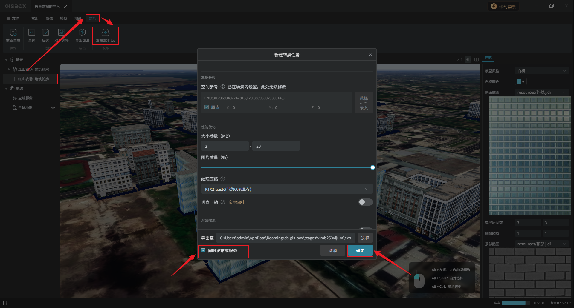 选中建筑图层,点击“建筑”Tab标签下的“发布3DTiles”,默认勾选“同时发布成服务”,点击“确定”。