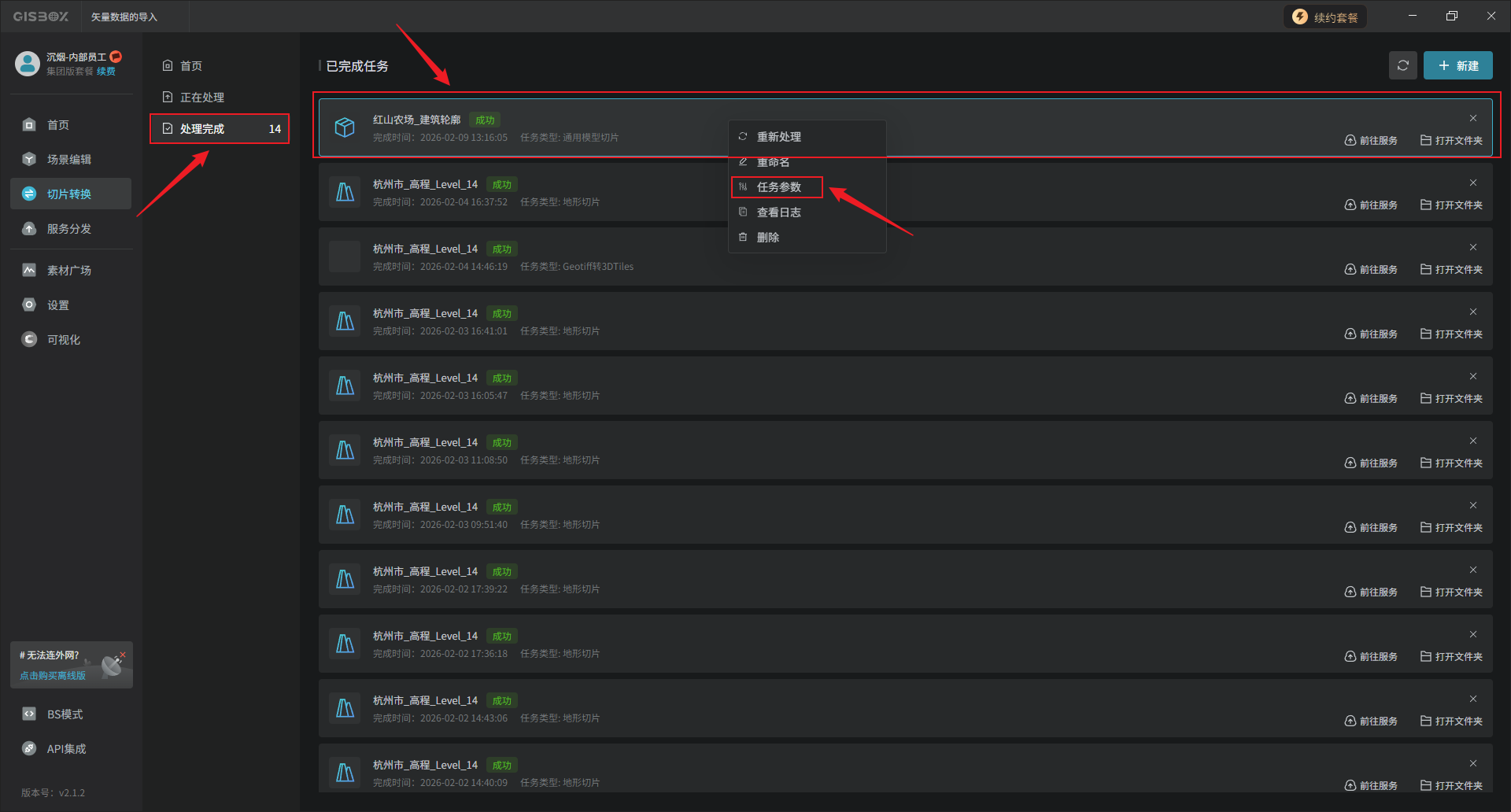 “切片转换”完成后自动跳转至“处理完成”界面。鼠标右键点击该任务,可以查看“任务参数”。