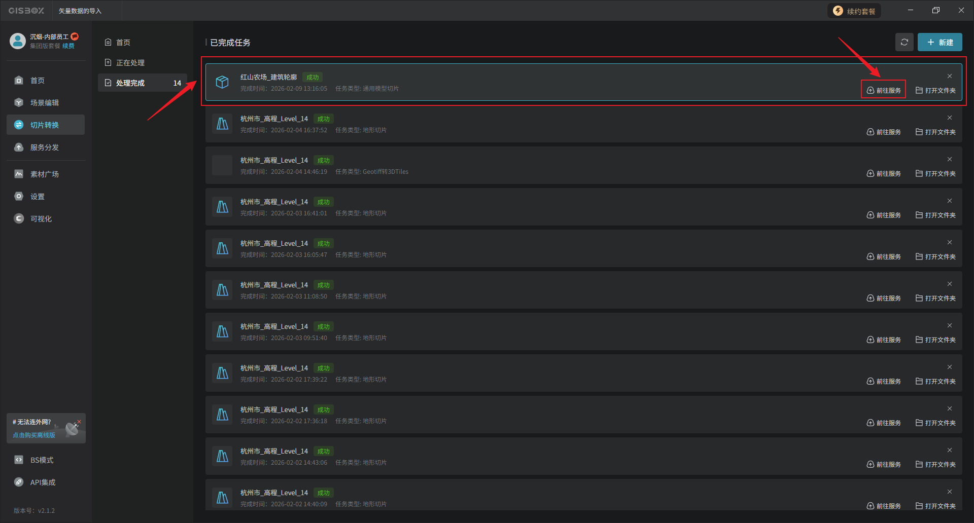 如果在“发布3DTiles”时的设置弹窗中勾选了“同时发布成服务”,转换成功后会自动发布成服务,可以在已完成的切片转换任务中点击“前往服务”。