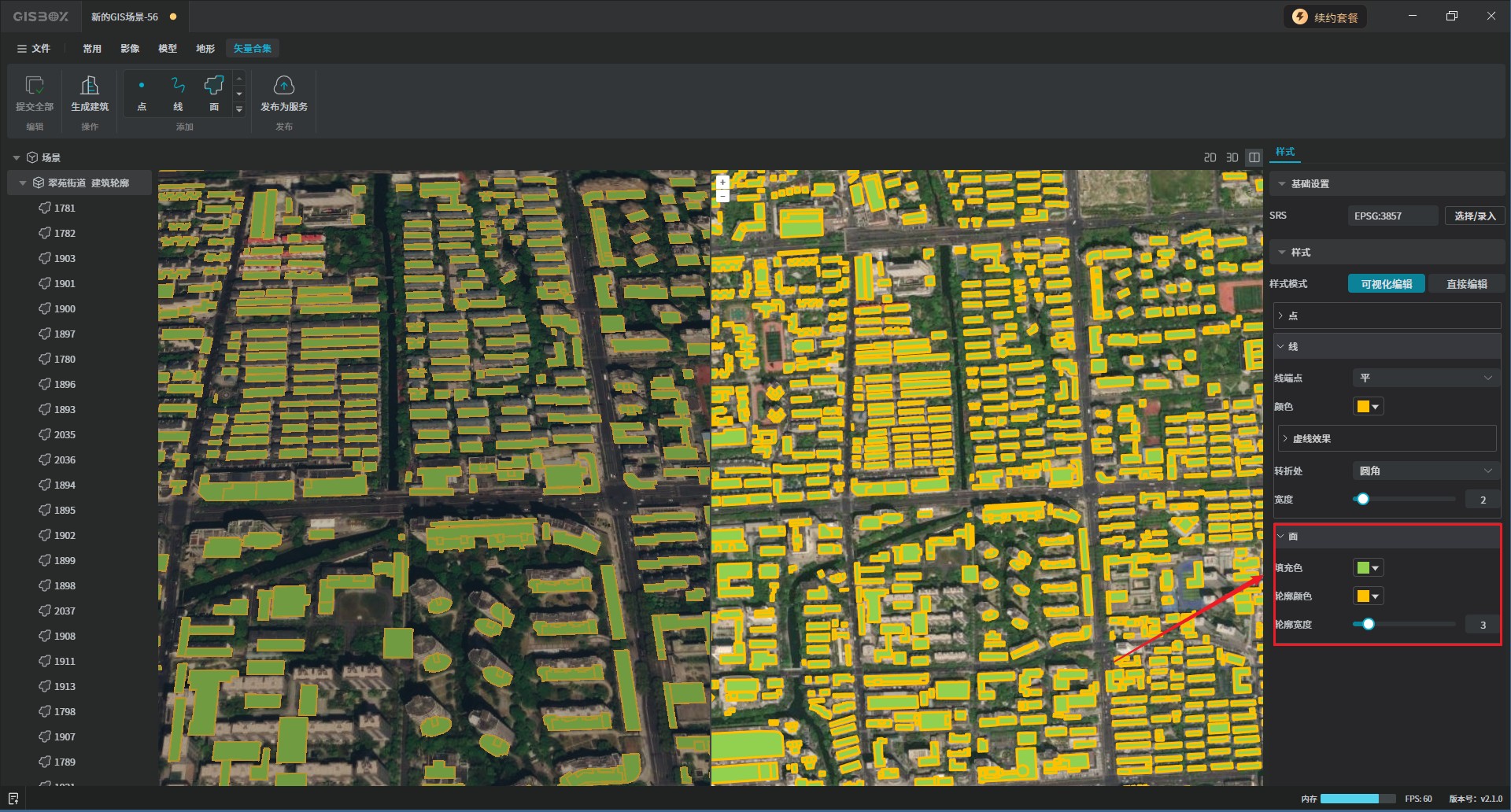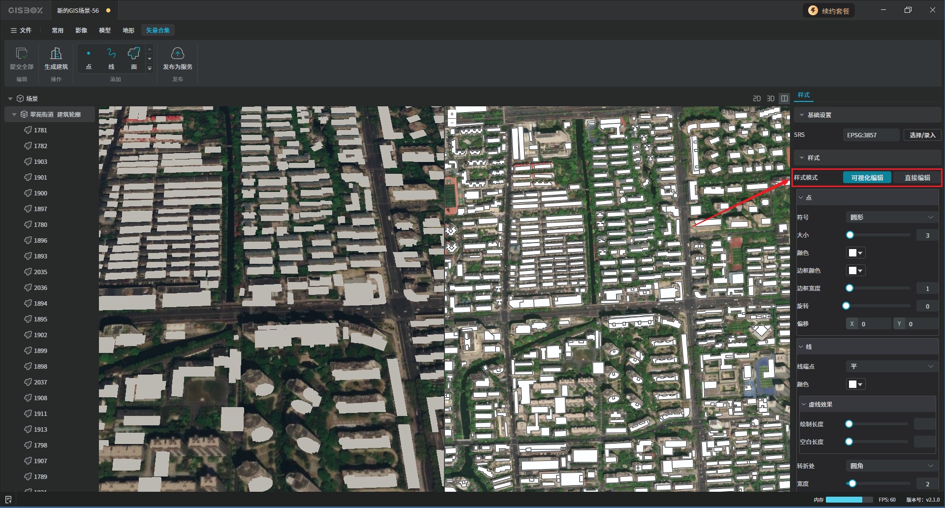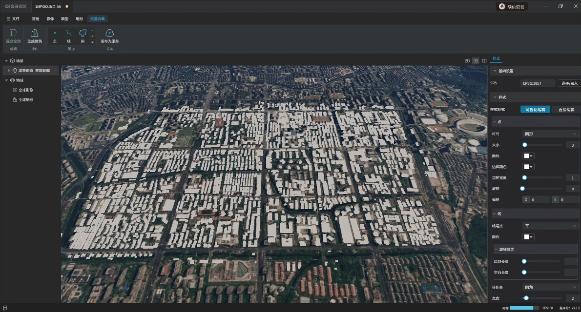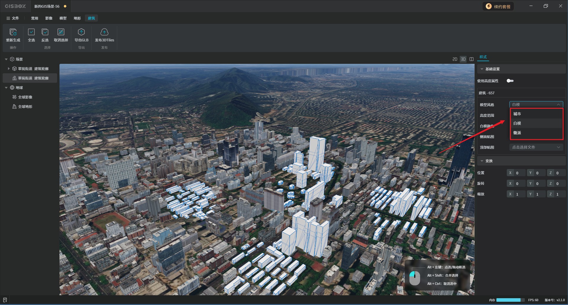 框选完成后,在右侧的模型风格中选择想要的建筑风格,GISBox提供和三种建筑风格,分别是“白模”、“城市”和“徽派”。如下图所示: