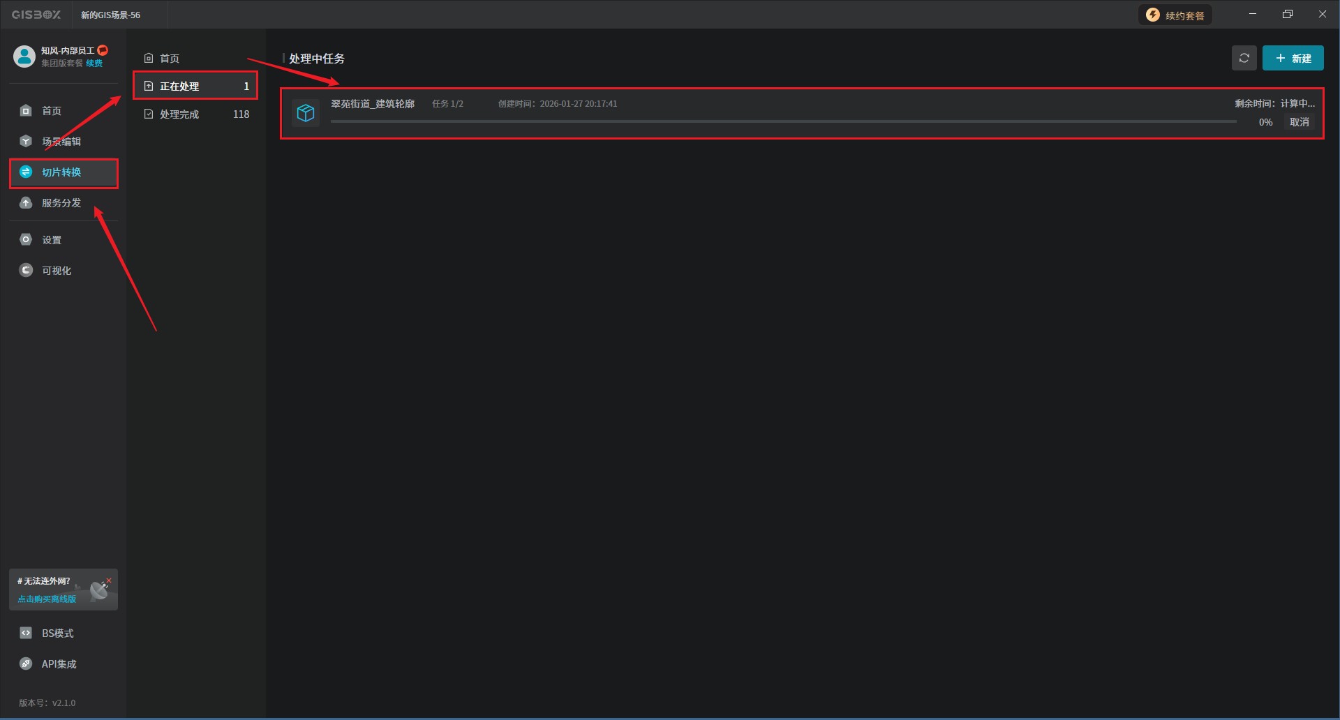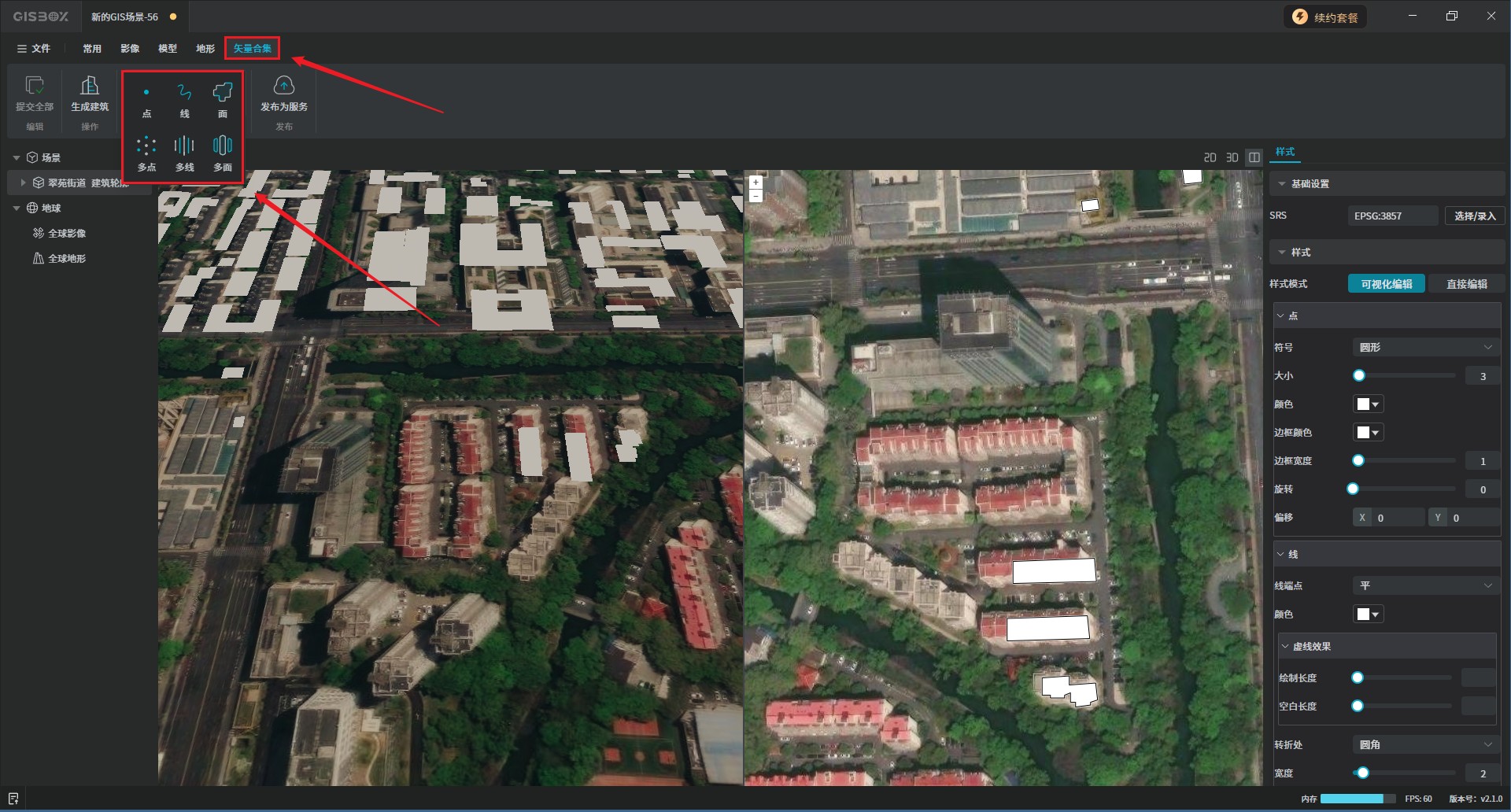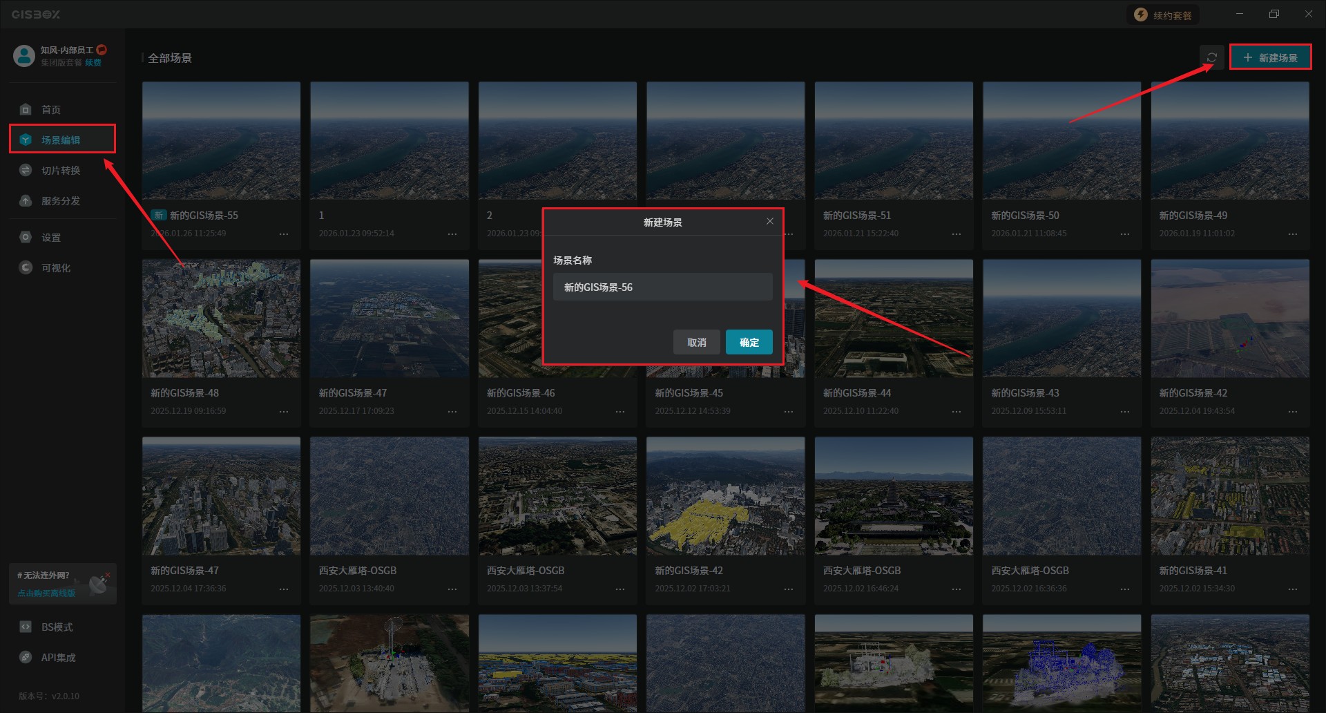 首先,打开GISBox软件,在场景编辑栏目中点击右上角的“新建场景”按钮来创建一个新的场景。