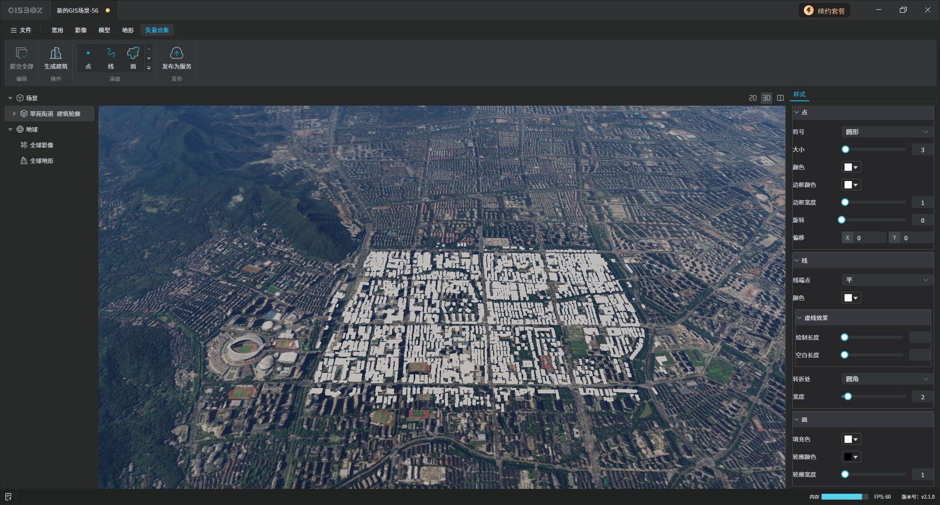 绘制完成后,点击右上角的“提交修改”,就可以在3D场景中看到所添加的矢量数据。如图所示: