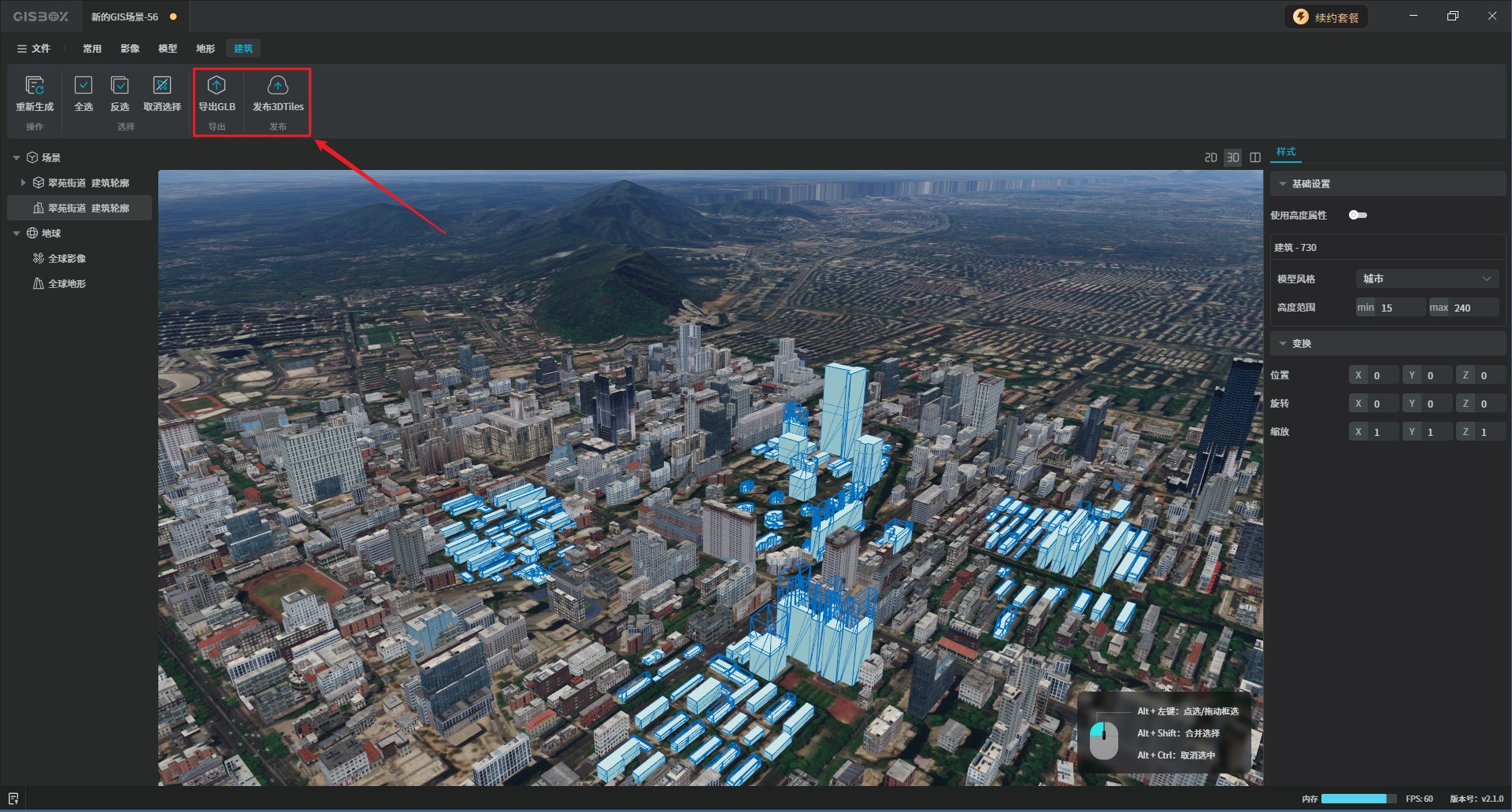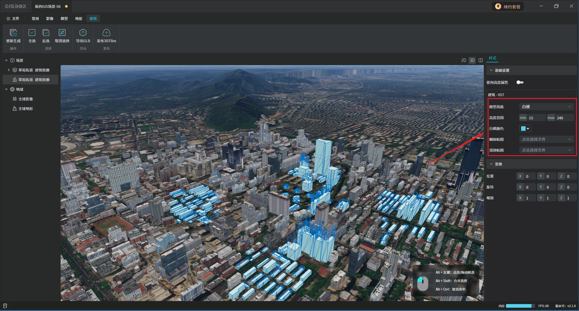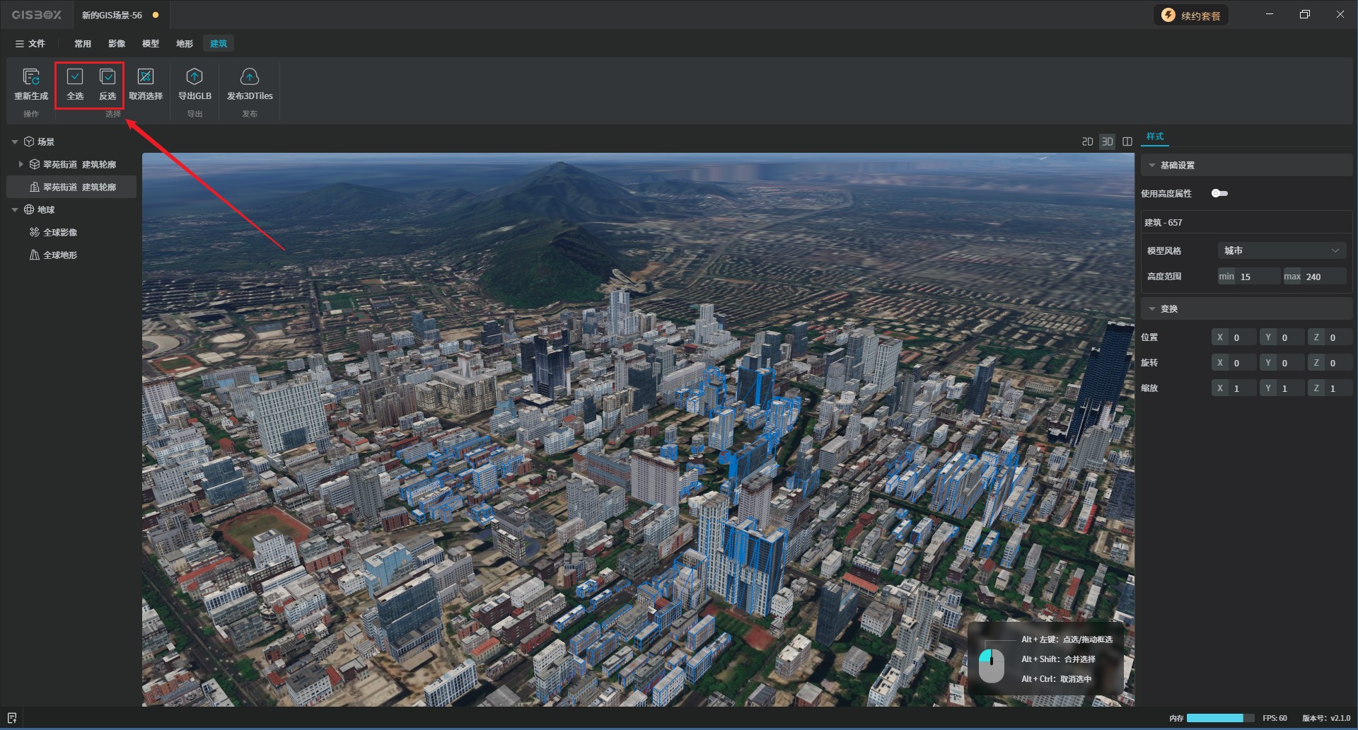 按住“shift+alt”键,可连续框选场景经中的批量建筑,也可以点击右上角的“全选”或“反选”按钮。如下图所示: