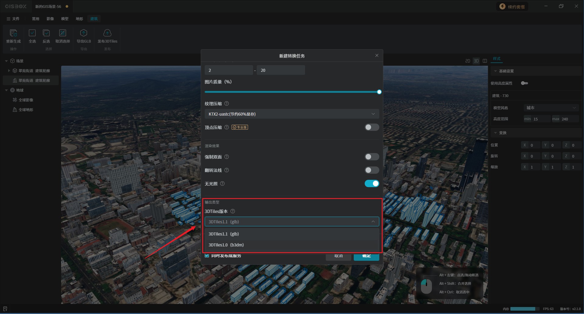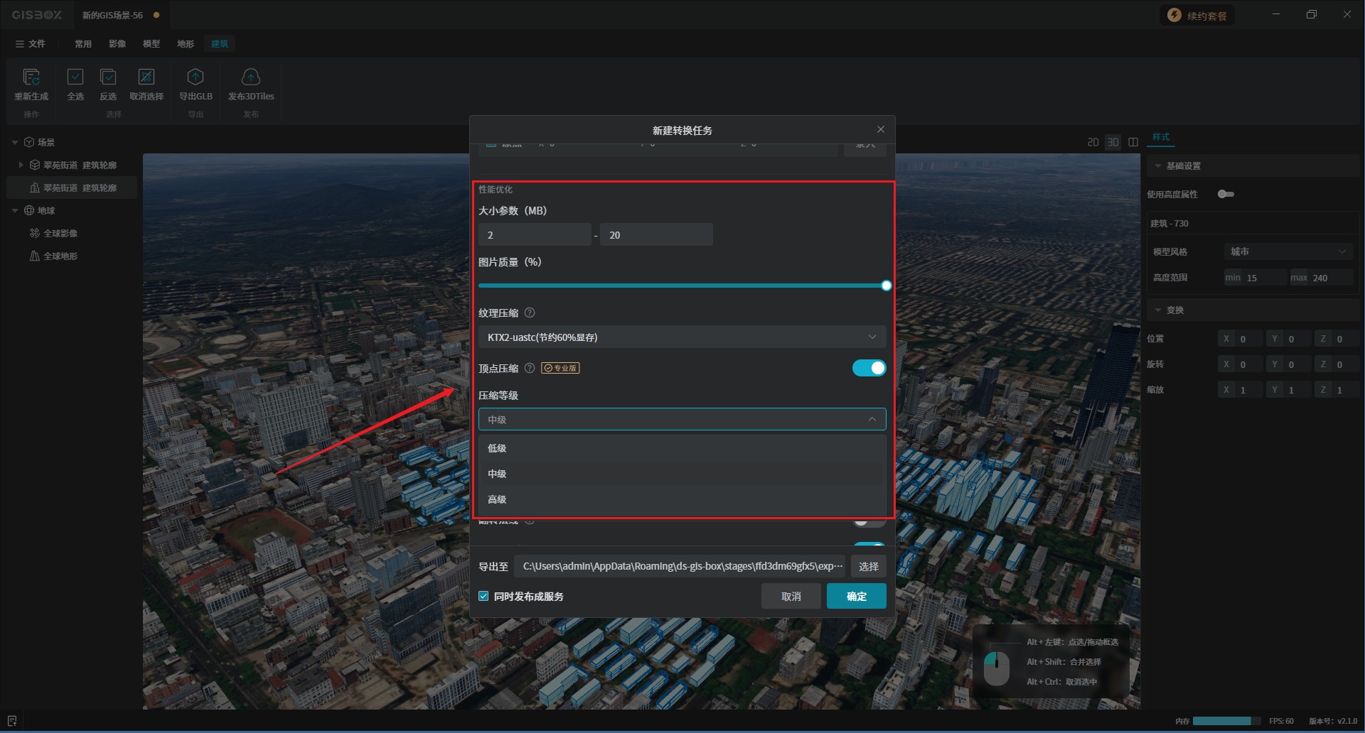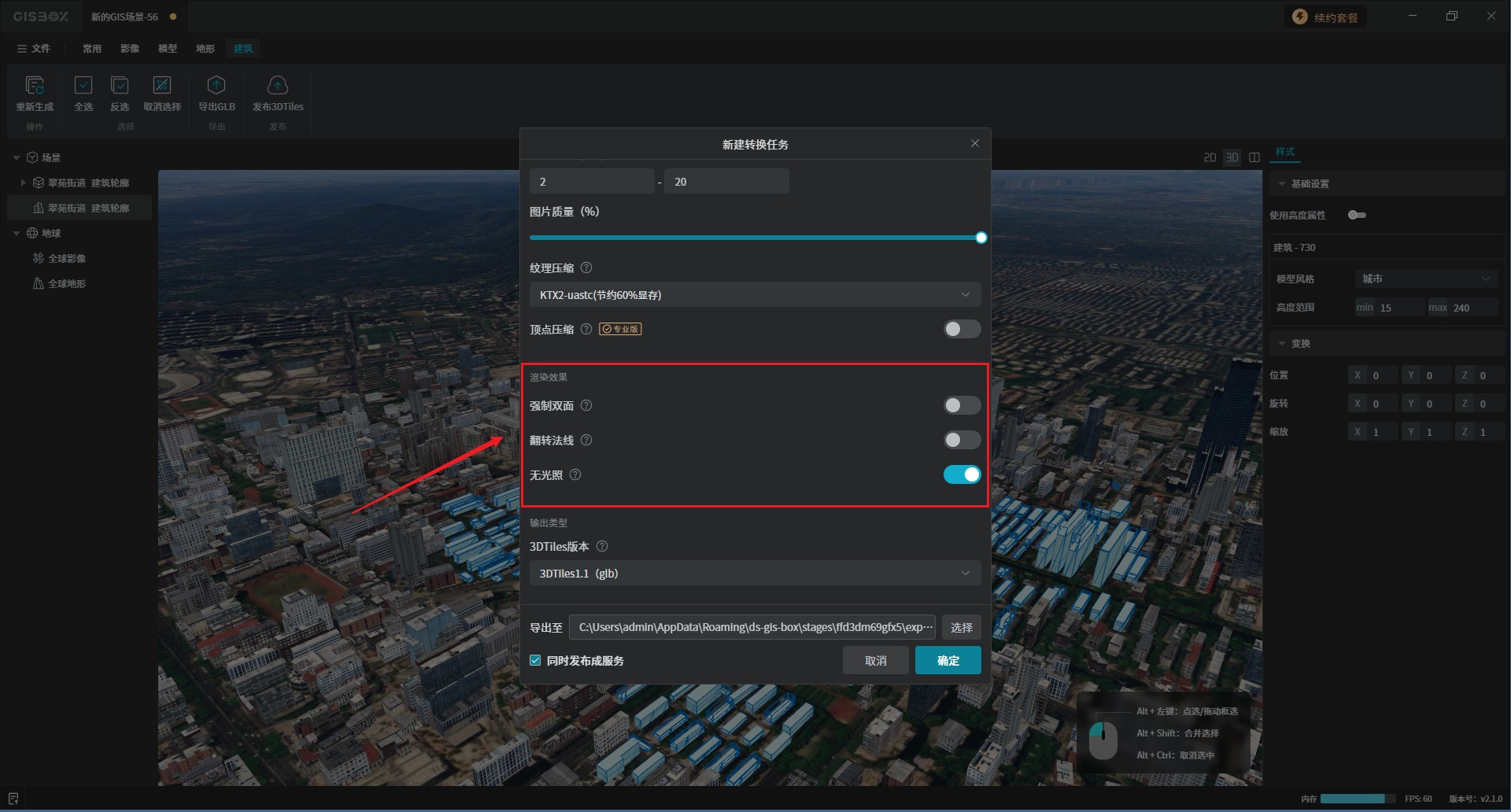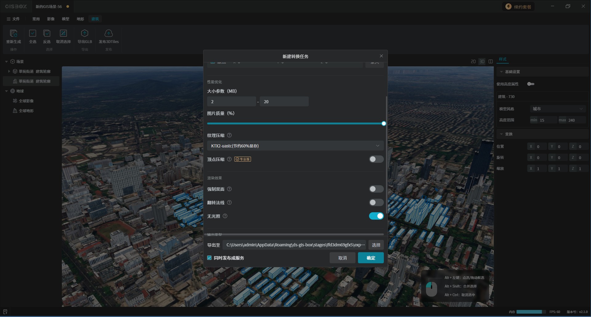 在上方的功能中可以将生成的SHP建筑模型导出为“GLB”格式,发布为“3DTiles”,如下图所示: