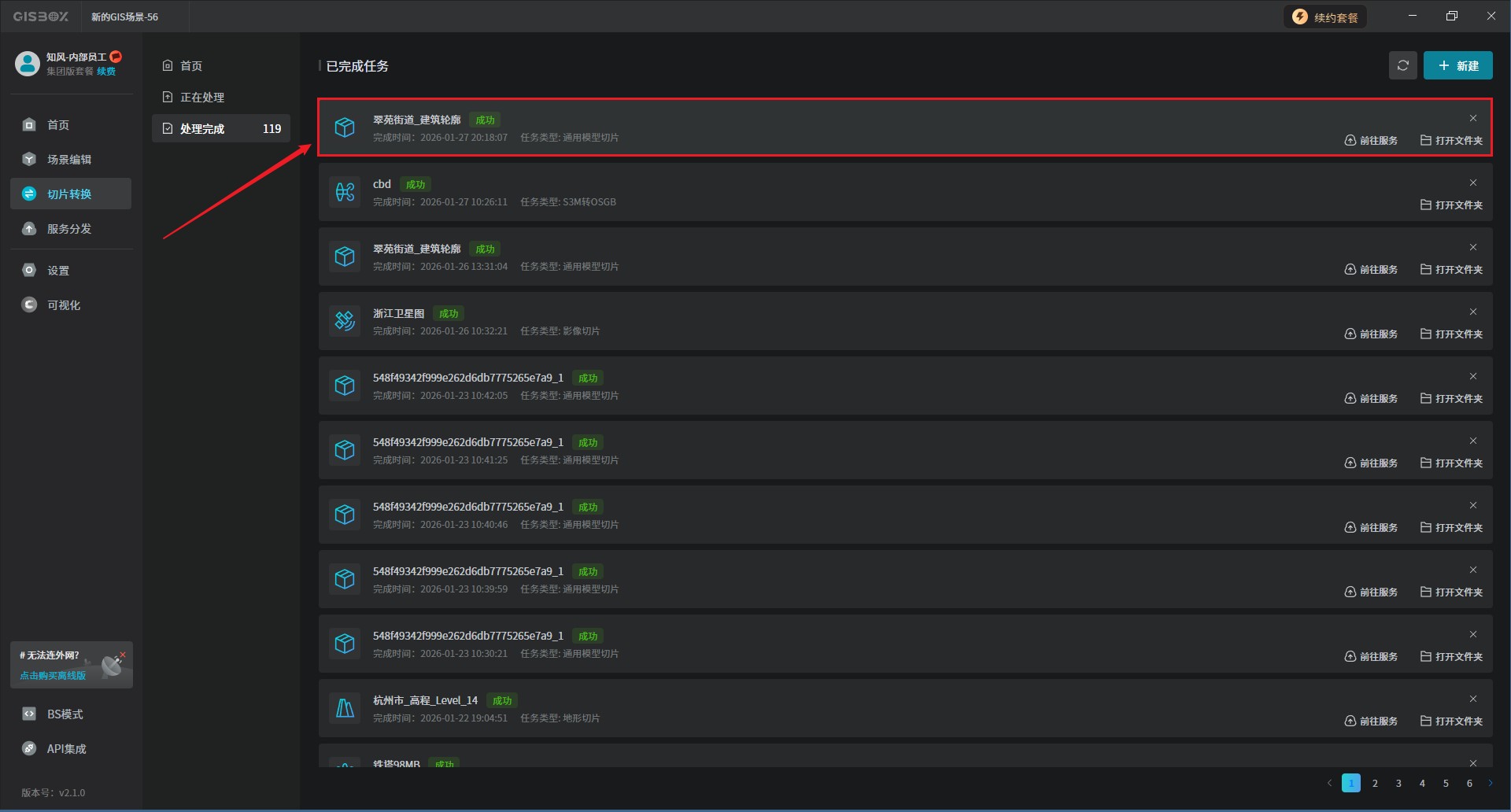 转换任务设置完成后,默认勾选了“同时发布成服务”时,点击“确定”按钮,建筑模型就会在“切片转换”的任务处理列表中进行转换,如下图所示: