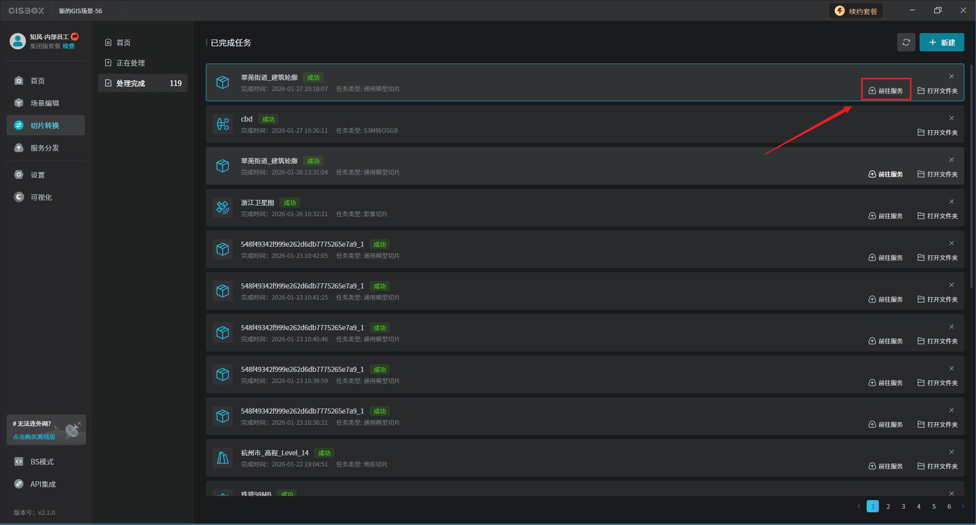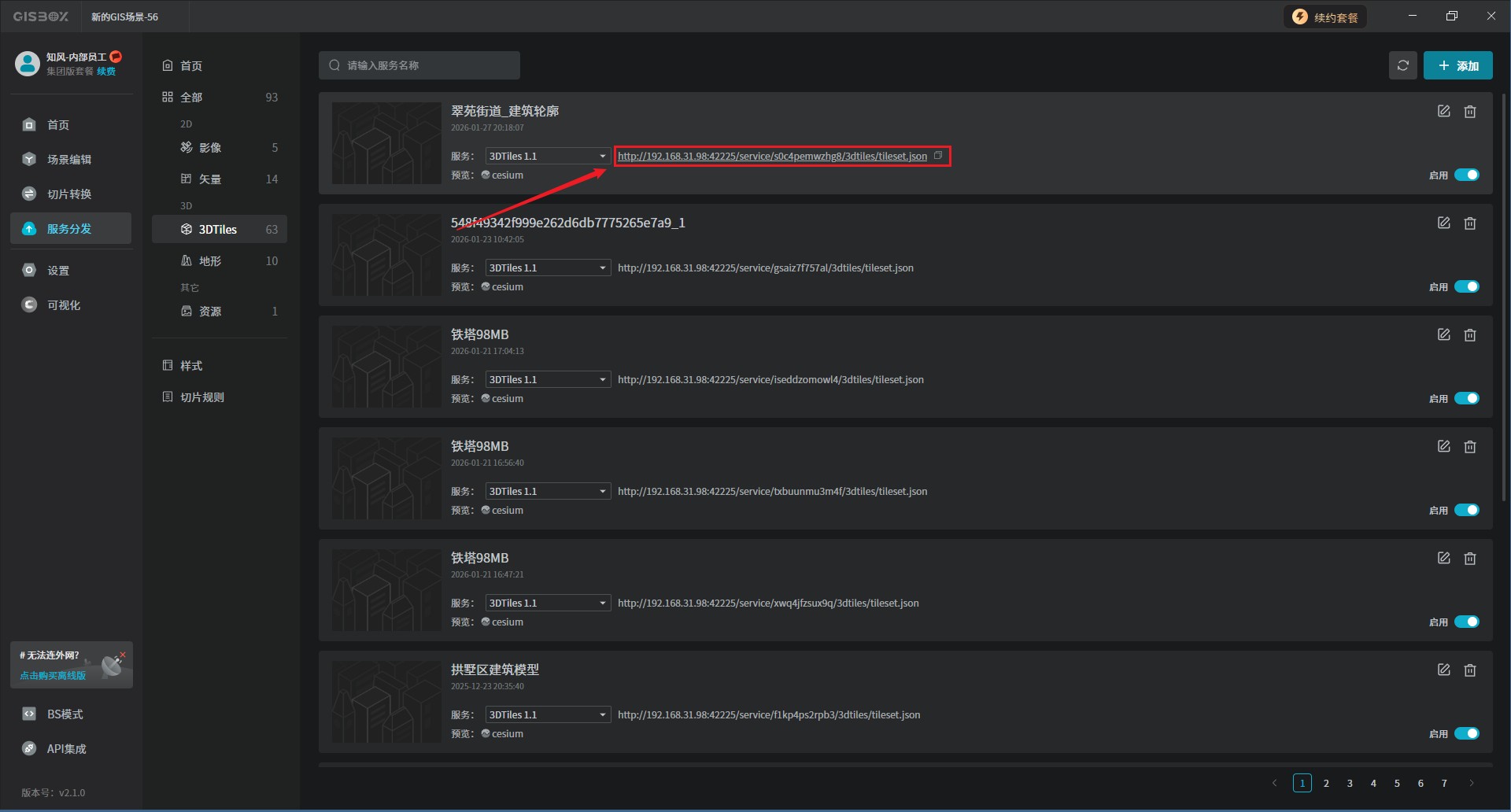 点击“前往服务按钮”就会立即跳转至“服务分发”界面,我们将会在“3DTiles”中看到已发布完成的服务,如下图所示: